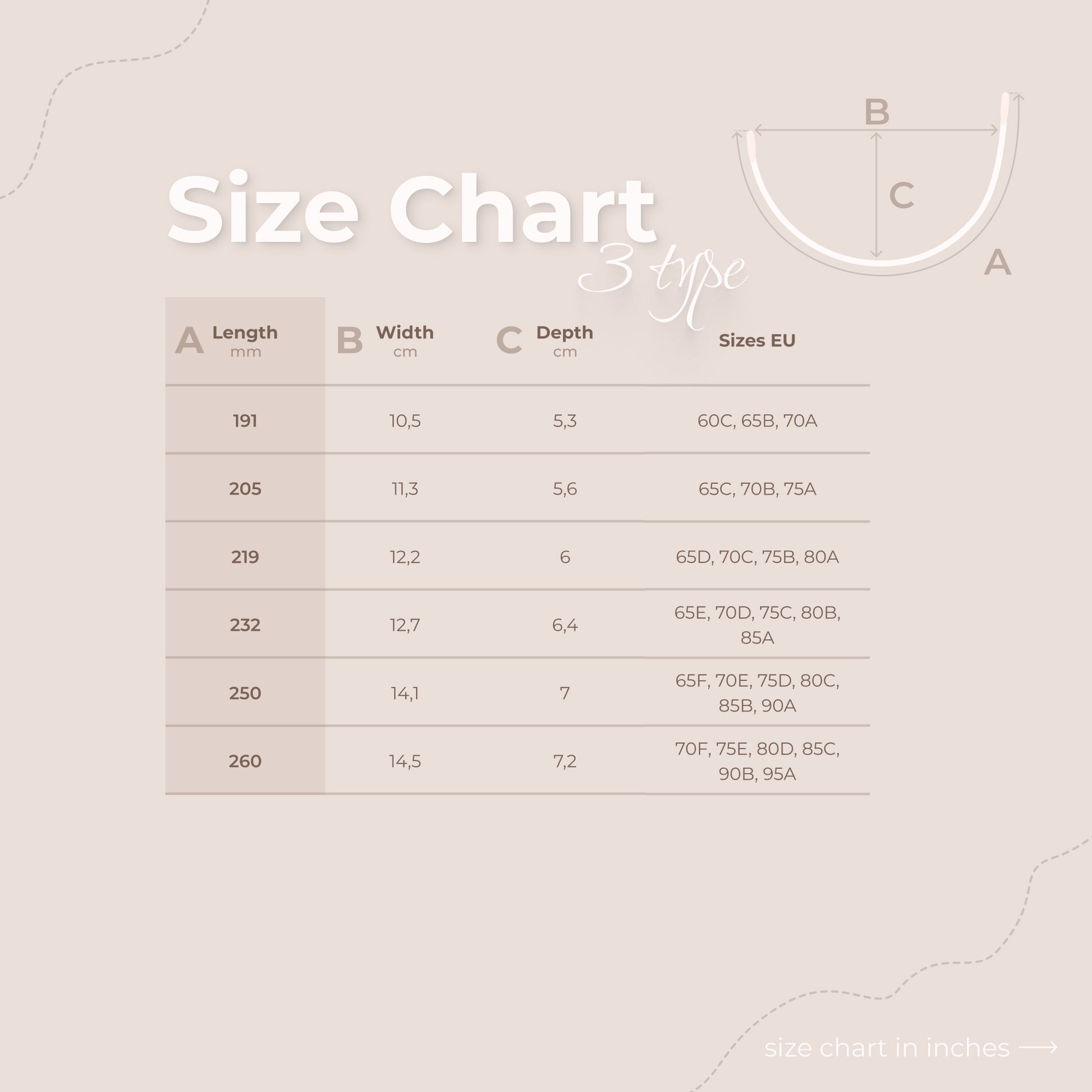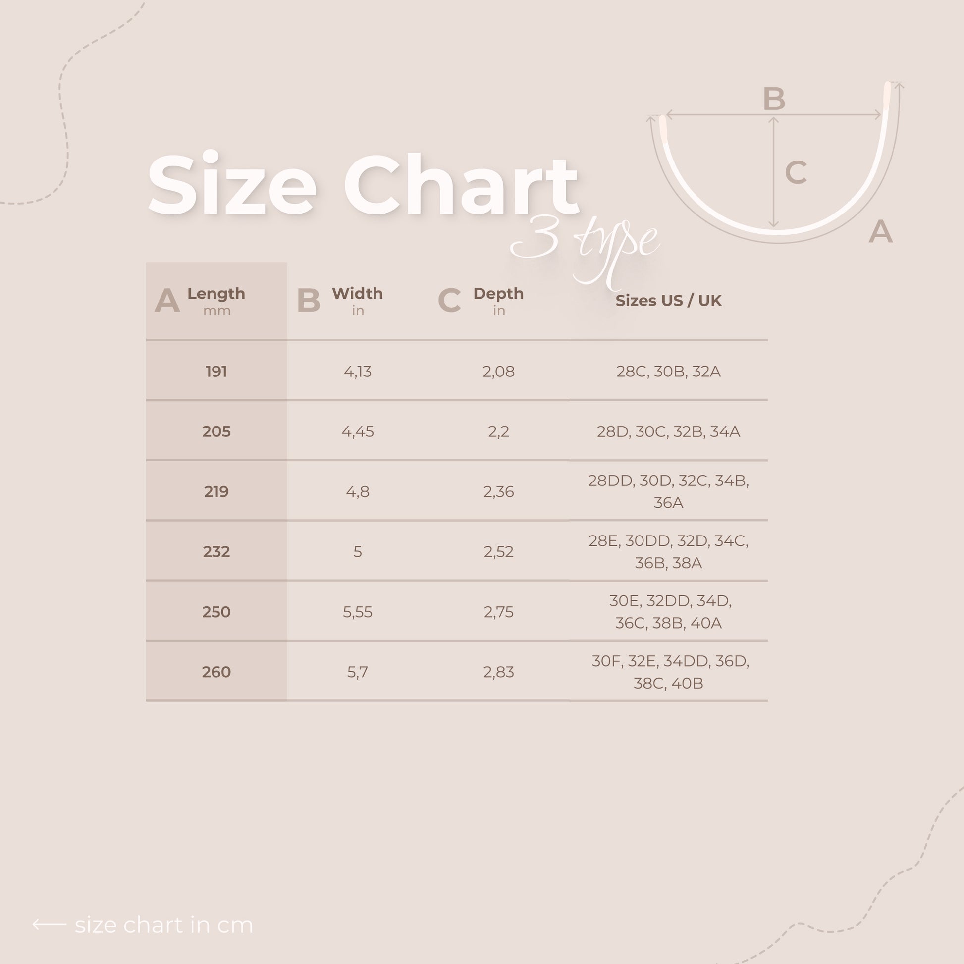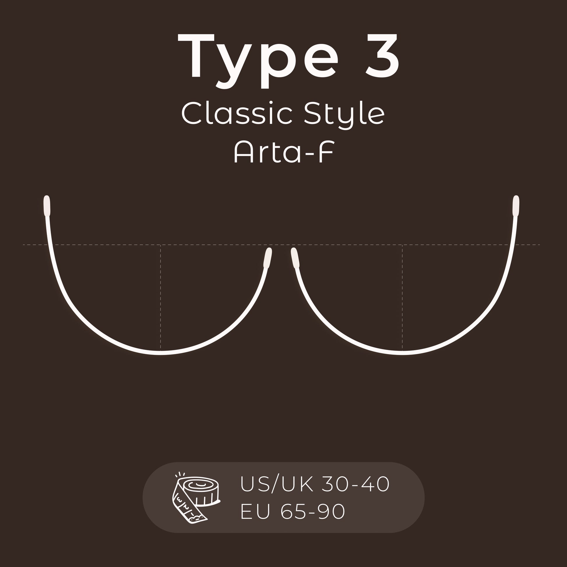 Muy similar al Tipo 1 (estándar, clásico). La principal diferencia es que los extremos del aro Tipo 3 son verticales, en lugar de estar ligeramente inclinados hacia los lados, lo que permite una menor distancia entre las copas. Además, el Tipo 3 tiene una base más estrecha en comparación con el Tipo 1, proporcionando un mejor ajuste para quienes tienen los pechos más juntos, asegurando mayor comodidad y soporte.