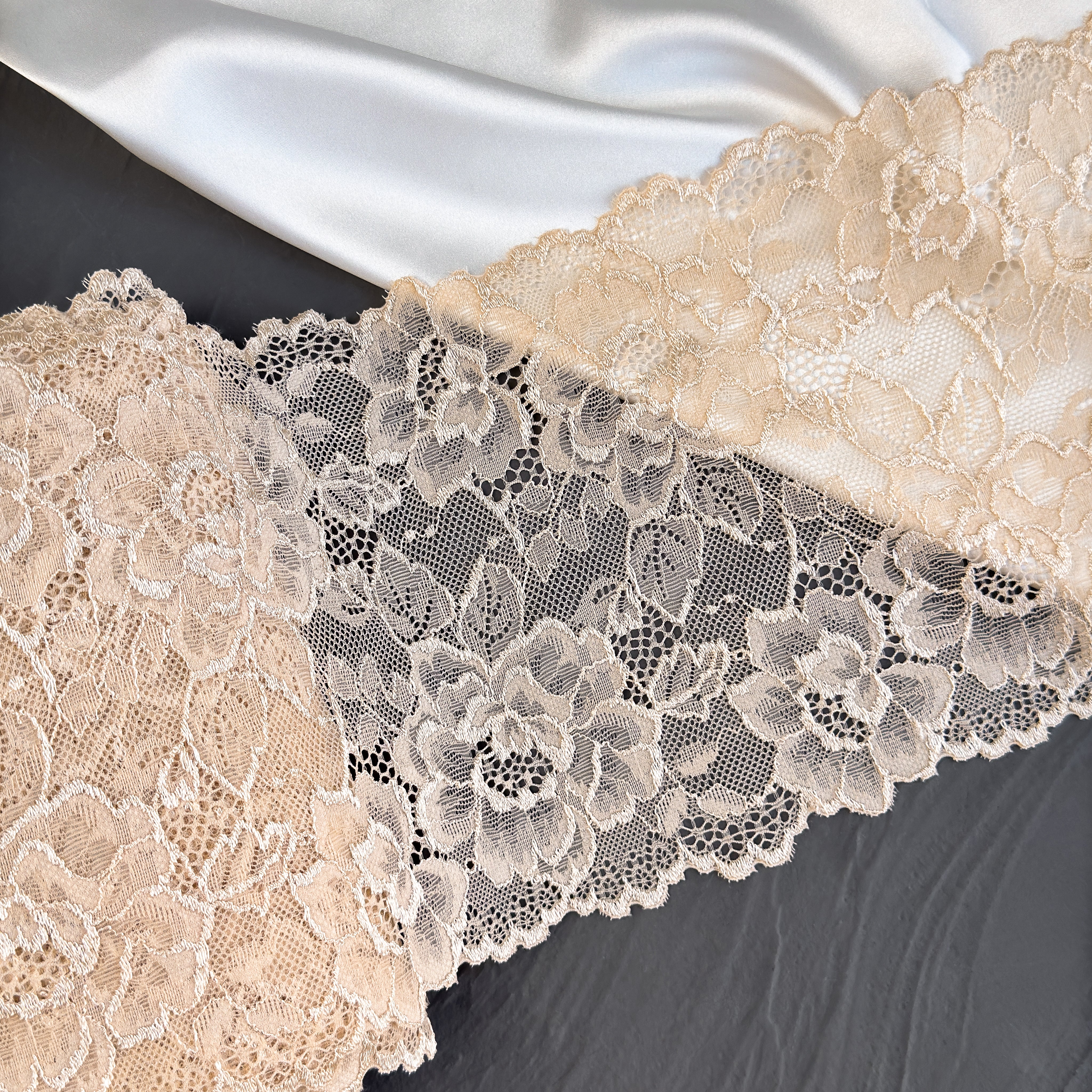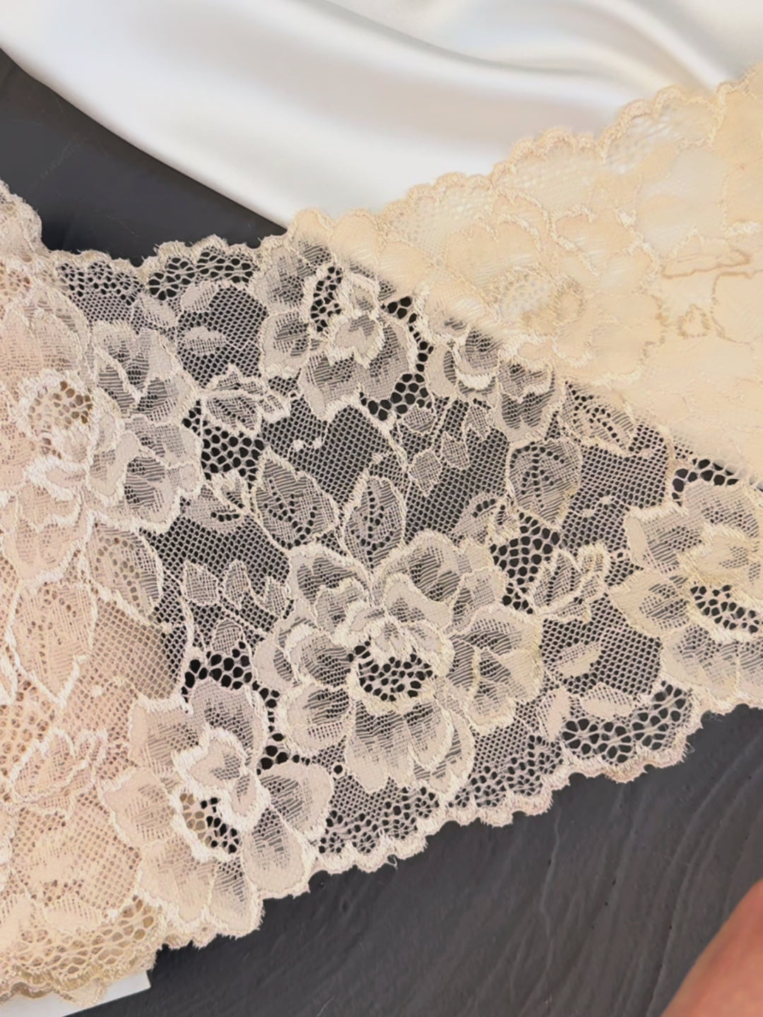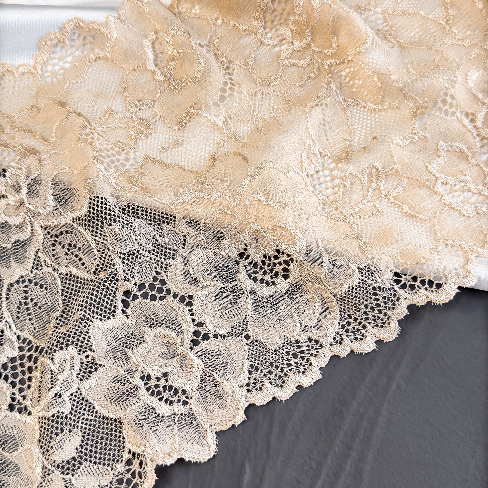 Ribete de encaje elástico beige suave con bordes festoneados que aportan un toque de elegancia. Fabricado en Europa, este encaje es versátil y de excelente calidad.