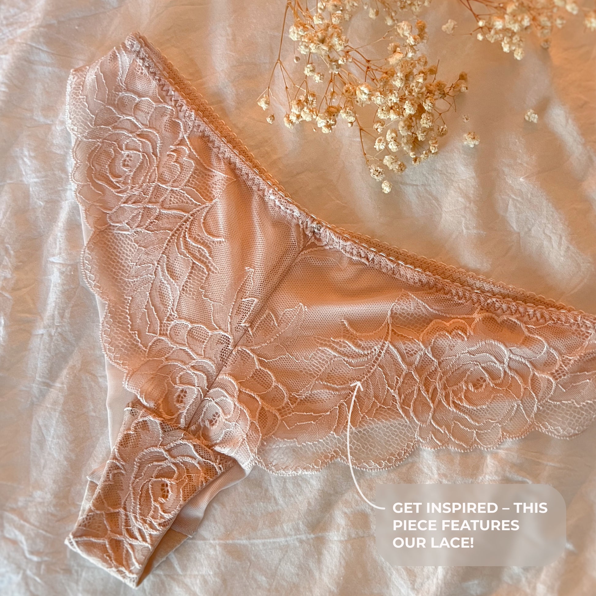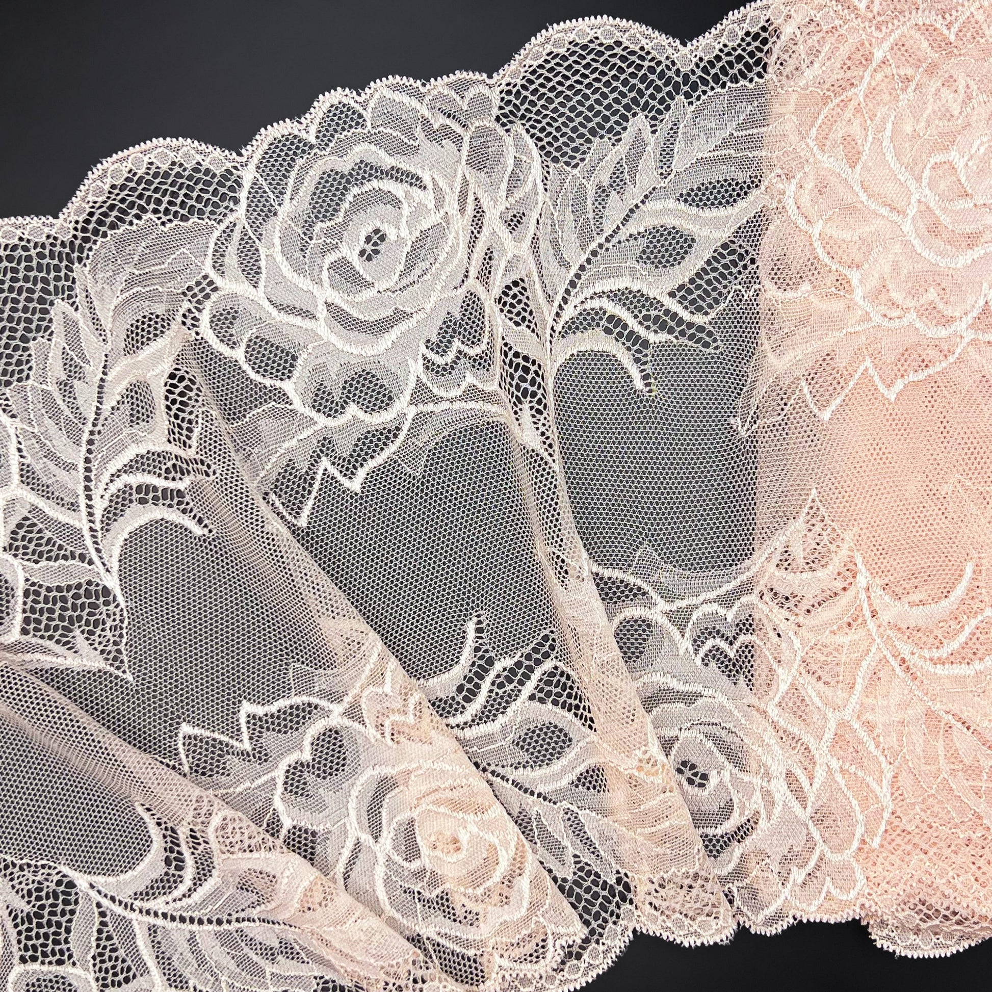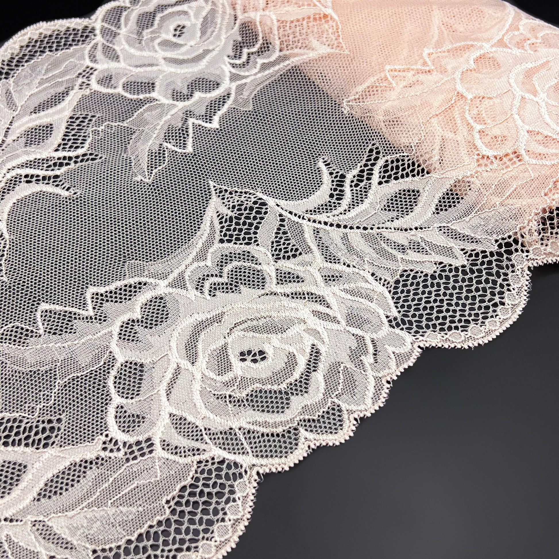 Ribete de encaje elástico beige de calidad premium. Suave y flexible, su diseño floral se realza aún más con detalles intrincados. Ideal para la confección de lencería, creación de sujetadores, costura de prendas, decoración y otros proyectos creativos.