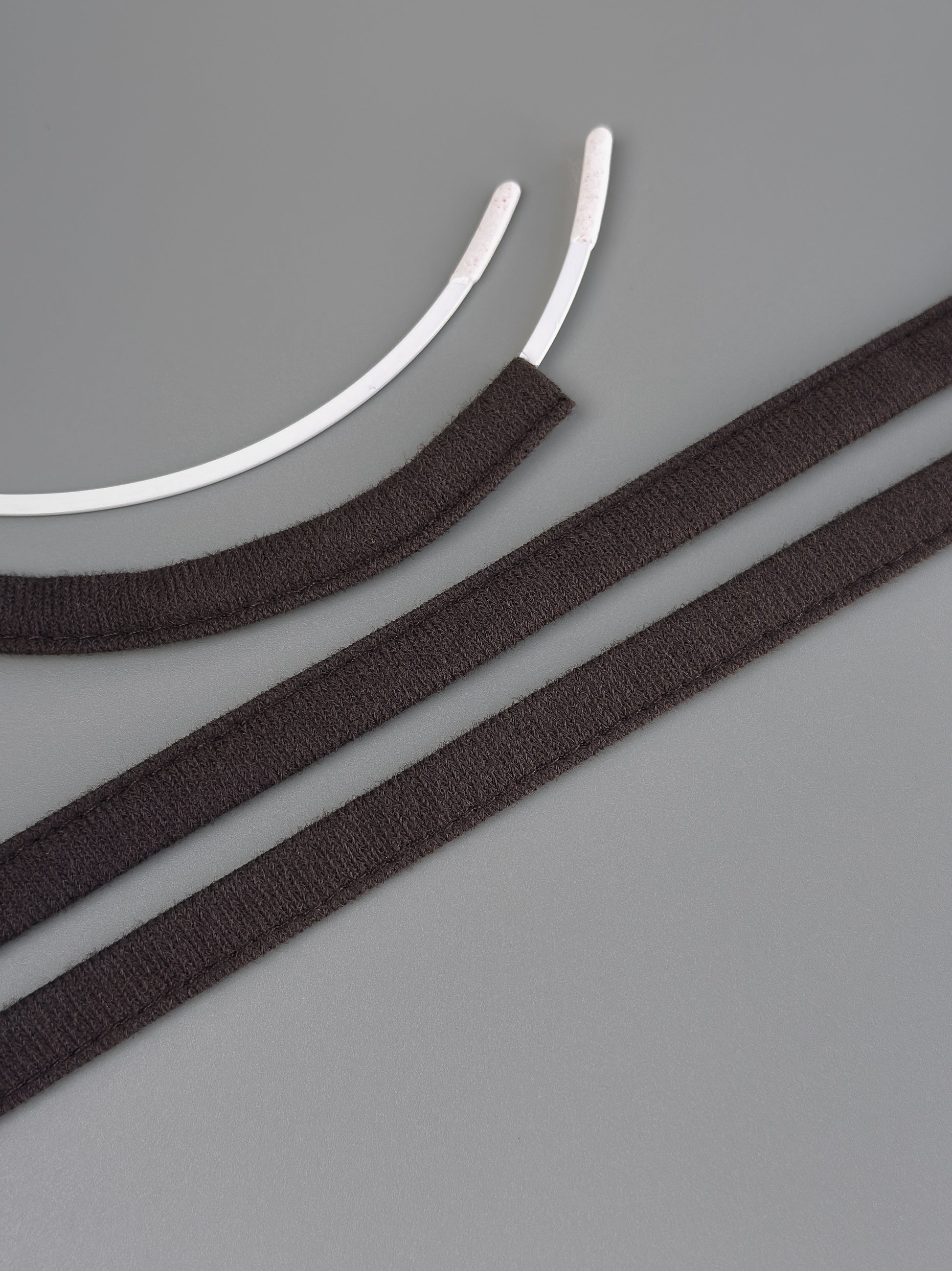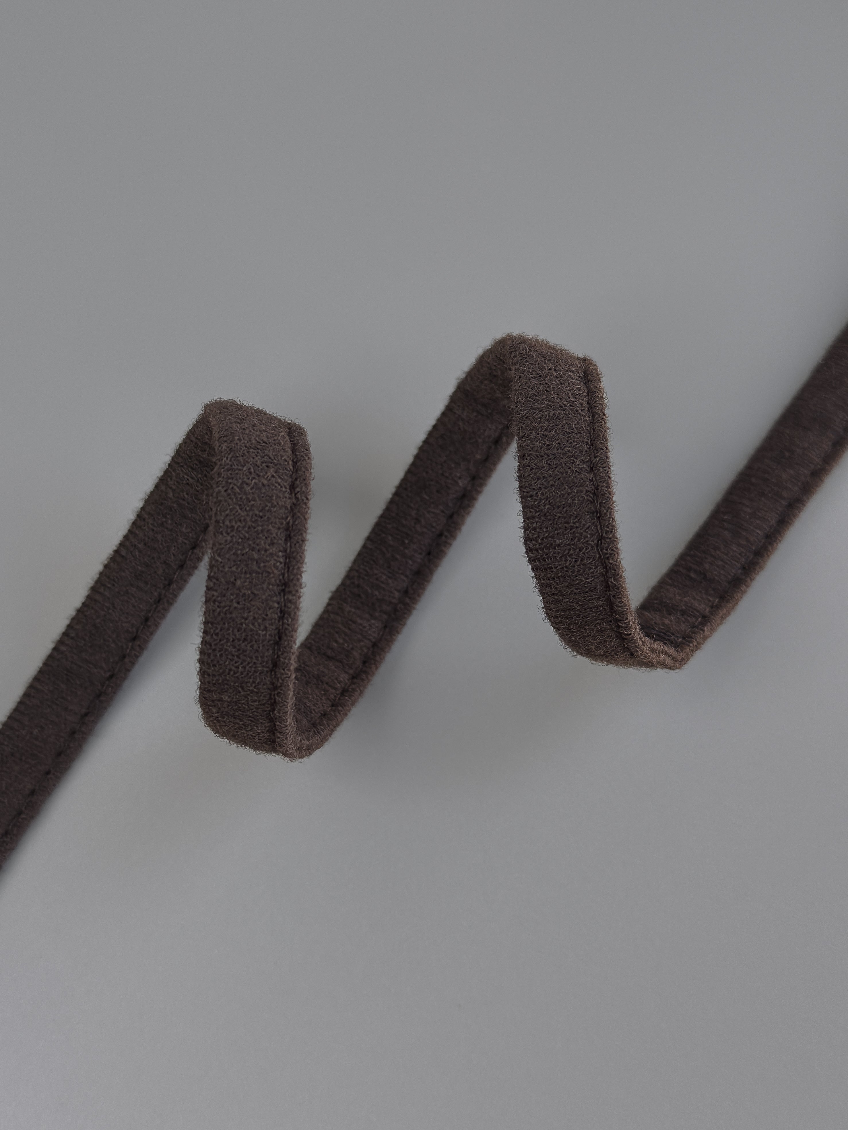 Plush underwire casing (underwire channeling / bra wire channeling) for sewing underwired bras. Non-stretch tape. With a thin inner lining, it stays flat and low-bulk, keeping seams neat without extra thickness. Soft and easy to sew, with a single side stitch that forms the channel for the underwire.