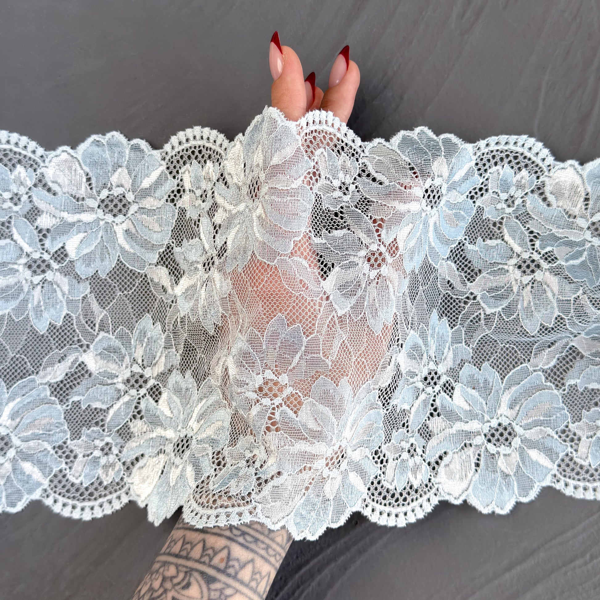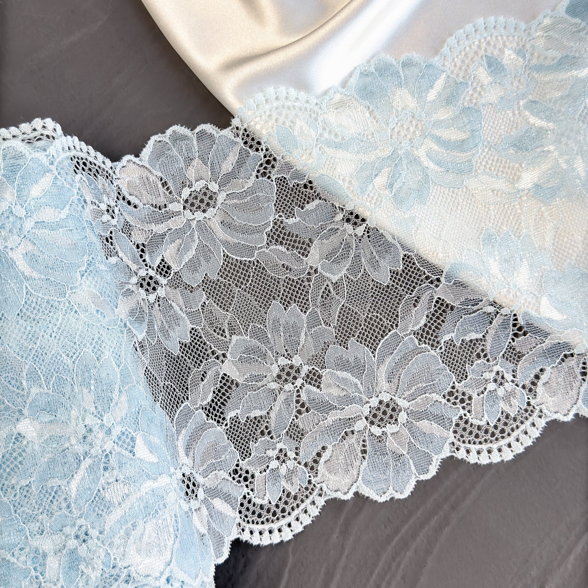 Soft floral lace in a muted pastel blue shade — ideal for bridal lingerie, panties, soft bralettes, and romantic sewing accents.