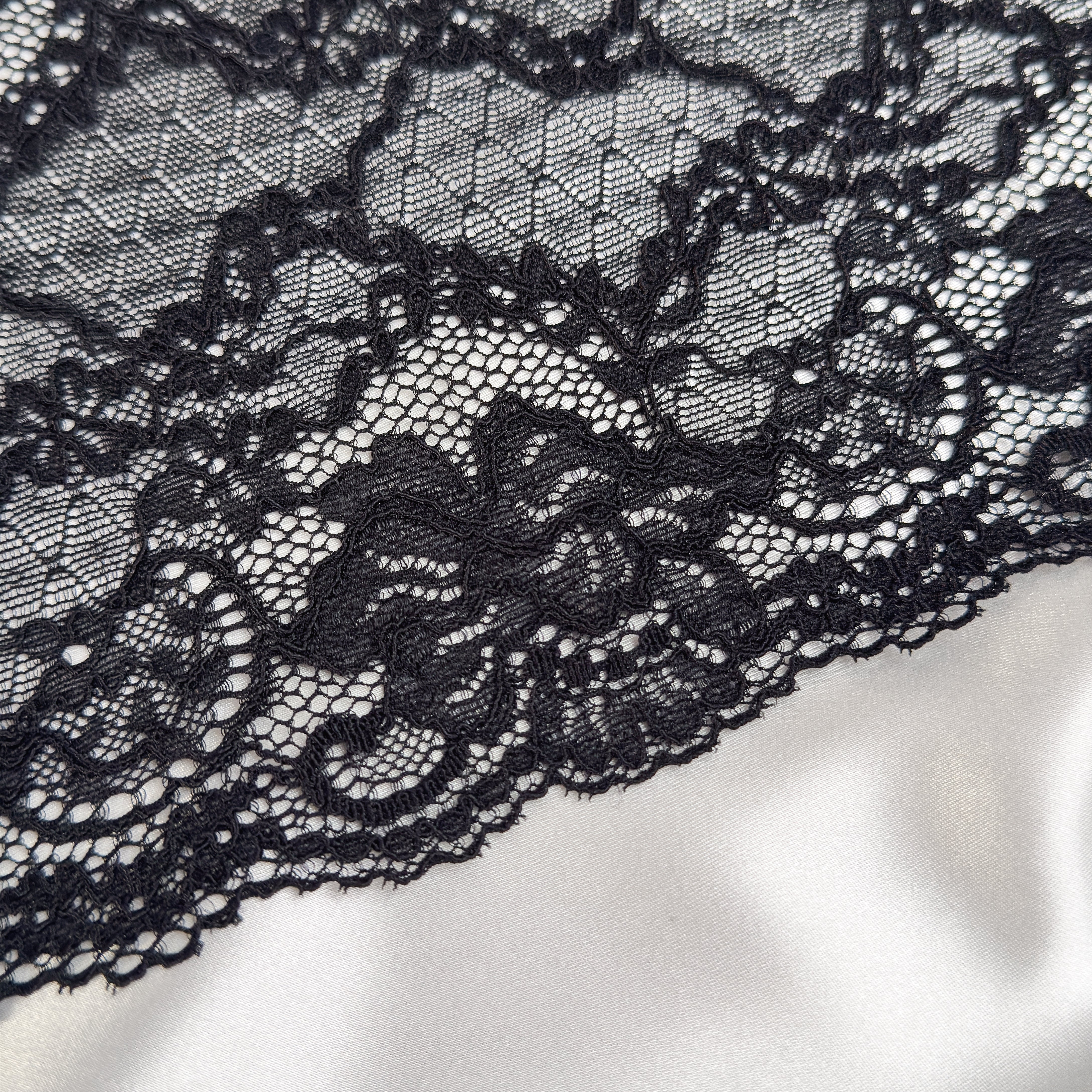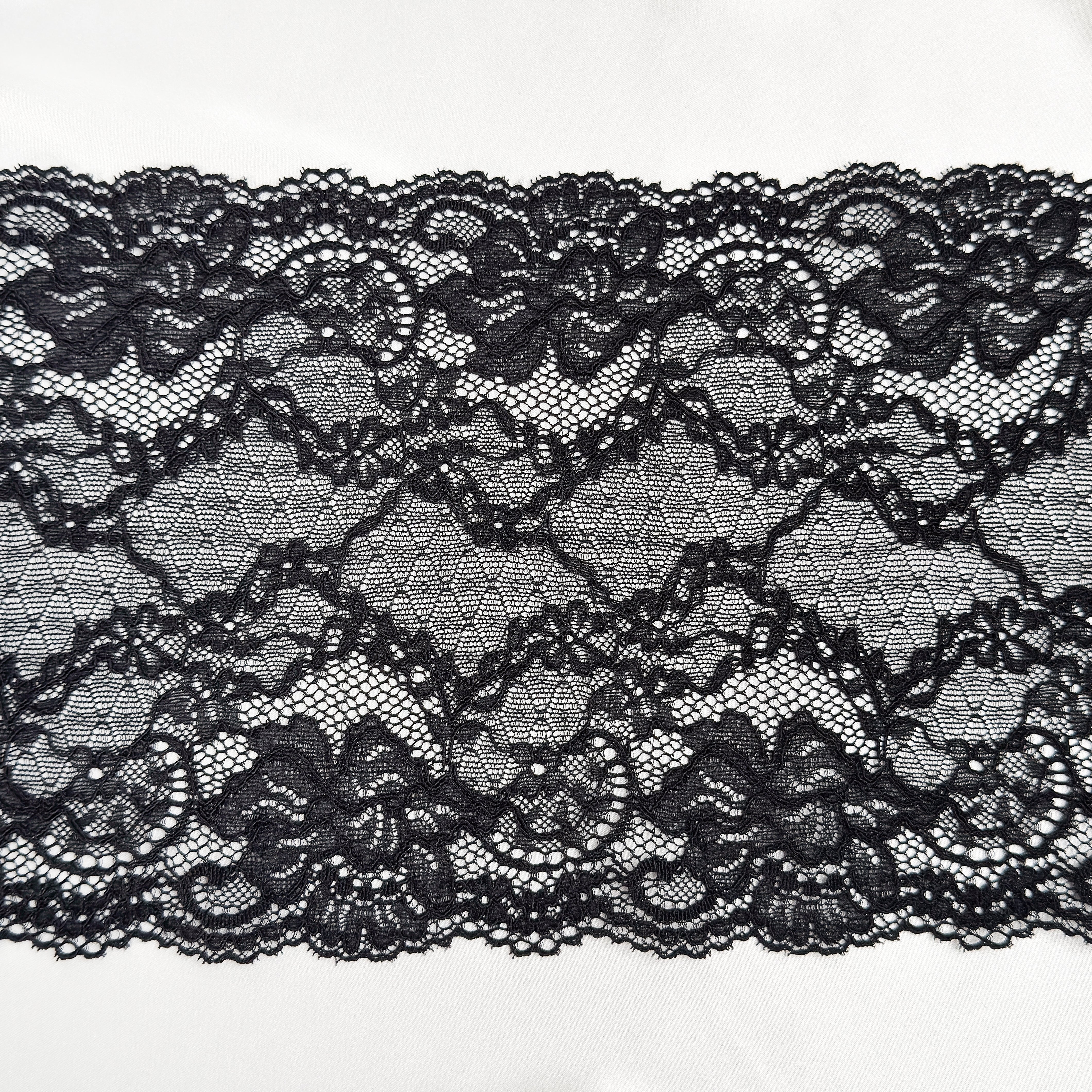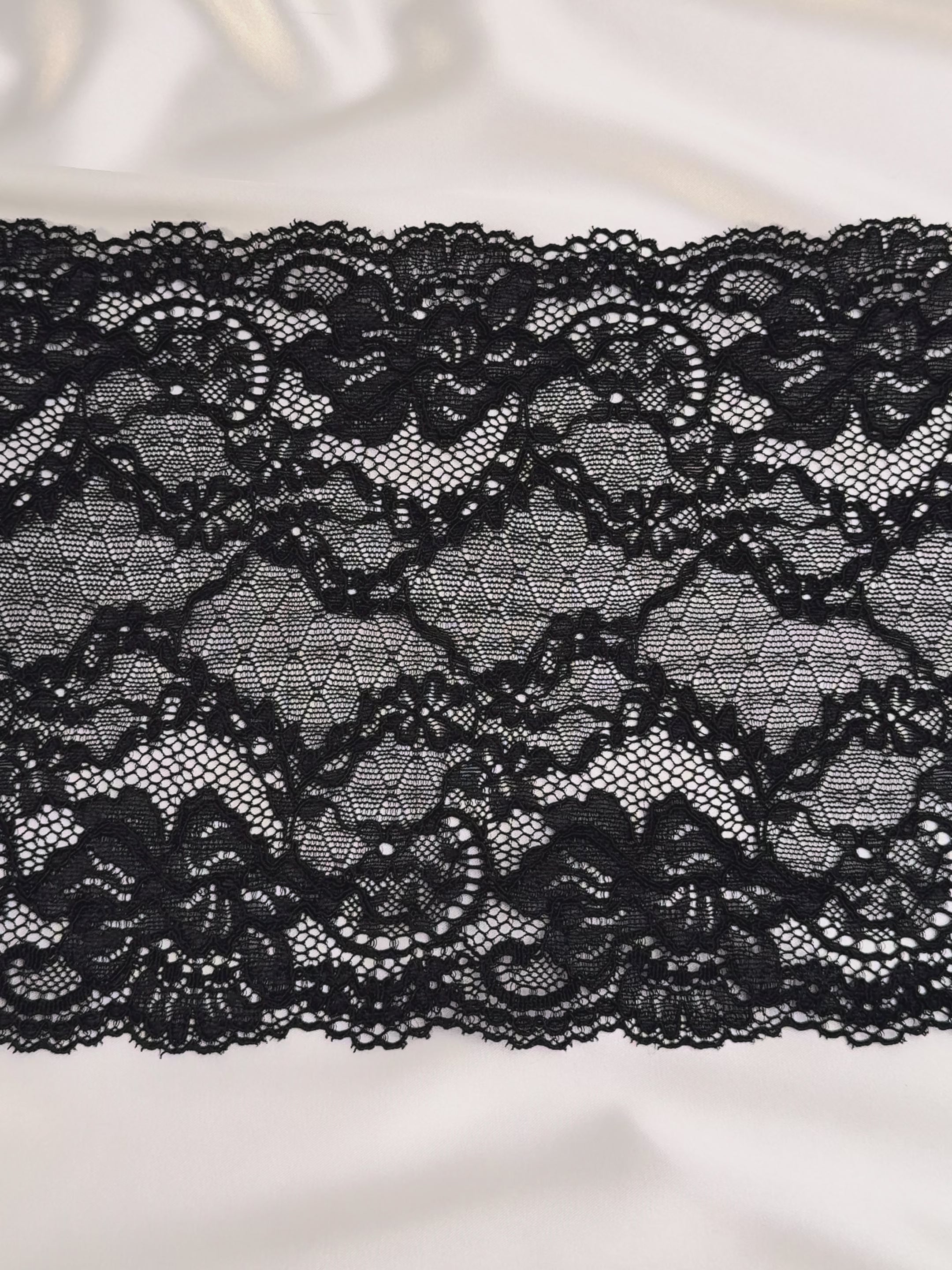 Premium European stretch lace in classic black, 18 cm wide, featuring a refined floral design with delicate corded detailing. Soft, flexible, and ideal for bra making, lingerie sewing, and intimate apparel projects.