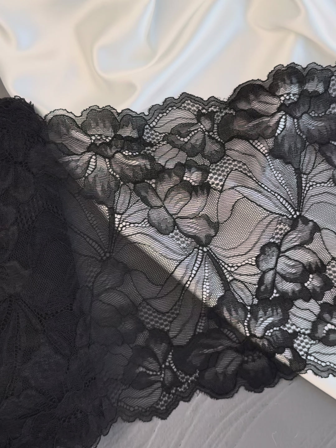 This is a black lace trim that feels silky to touch. Ideal for lingerie crafting, bra making, garment sewing, decor, and other crafts.
