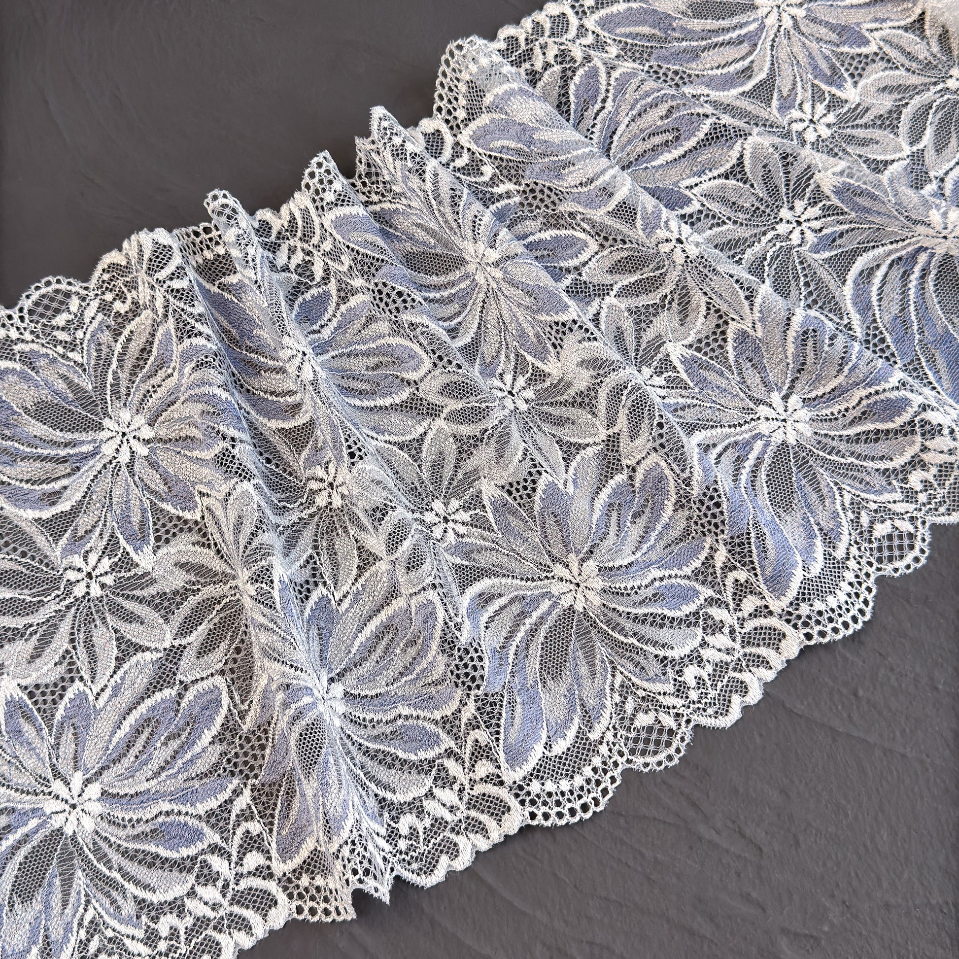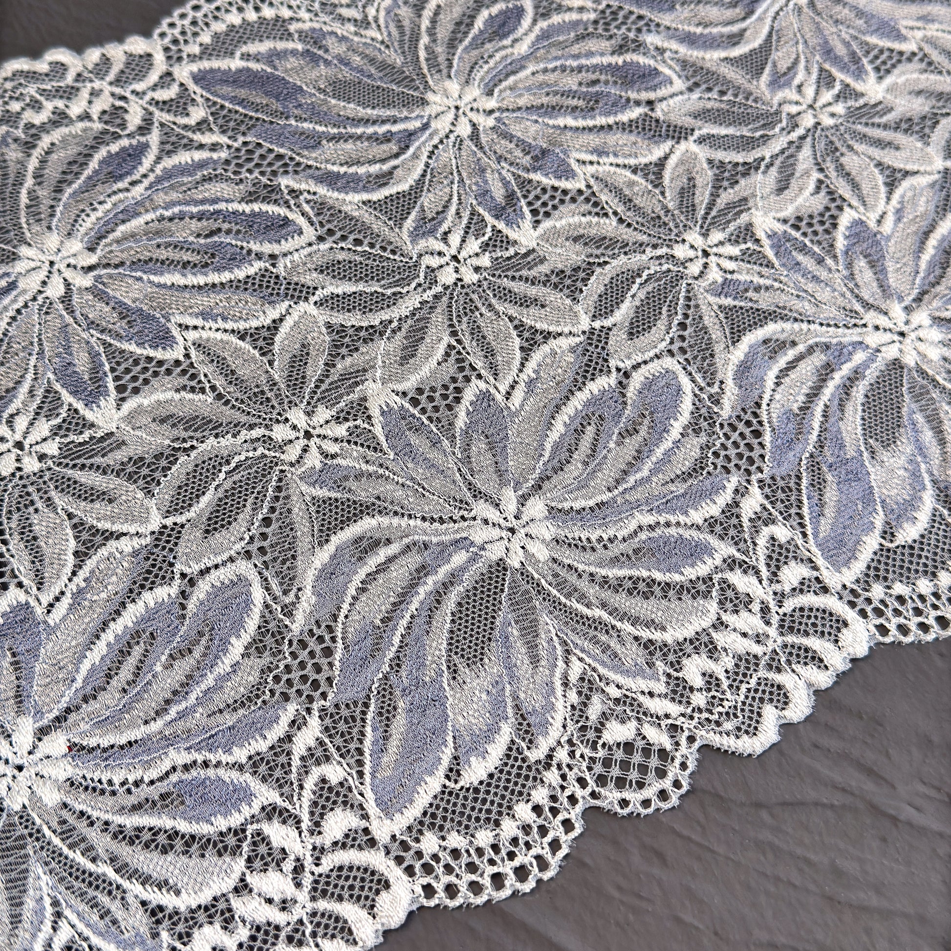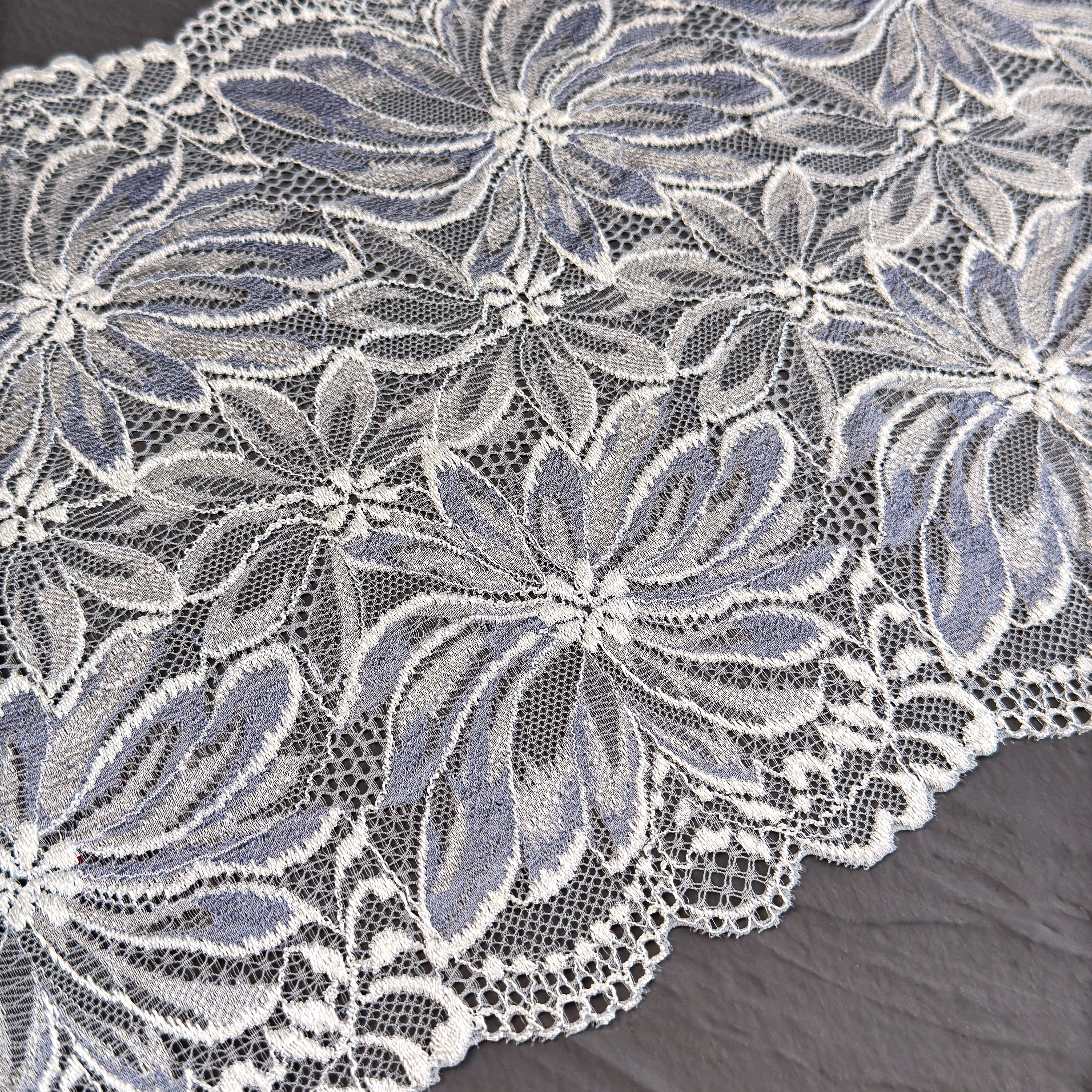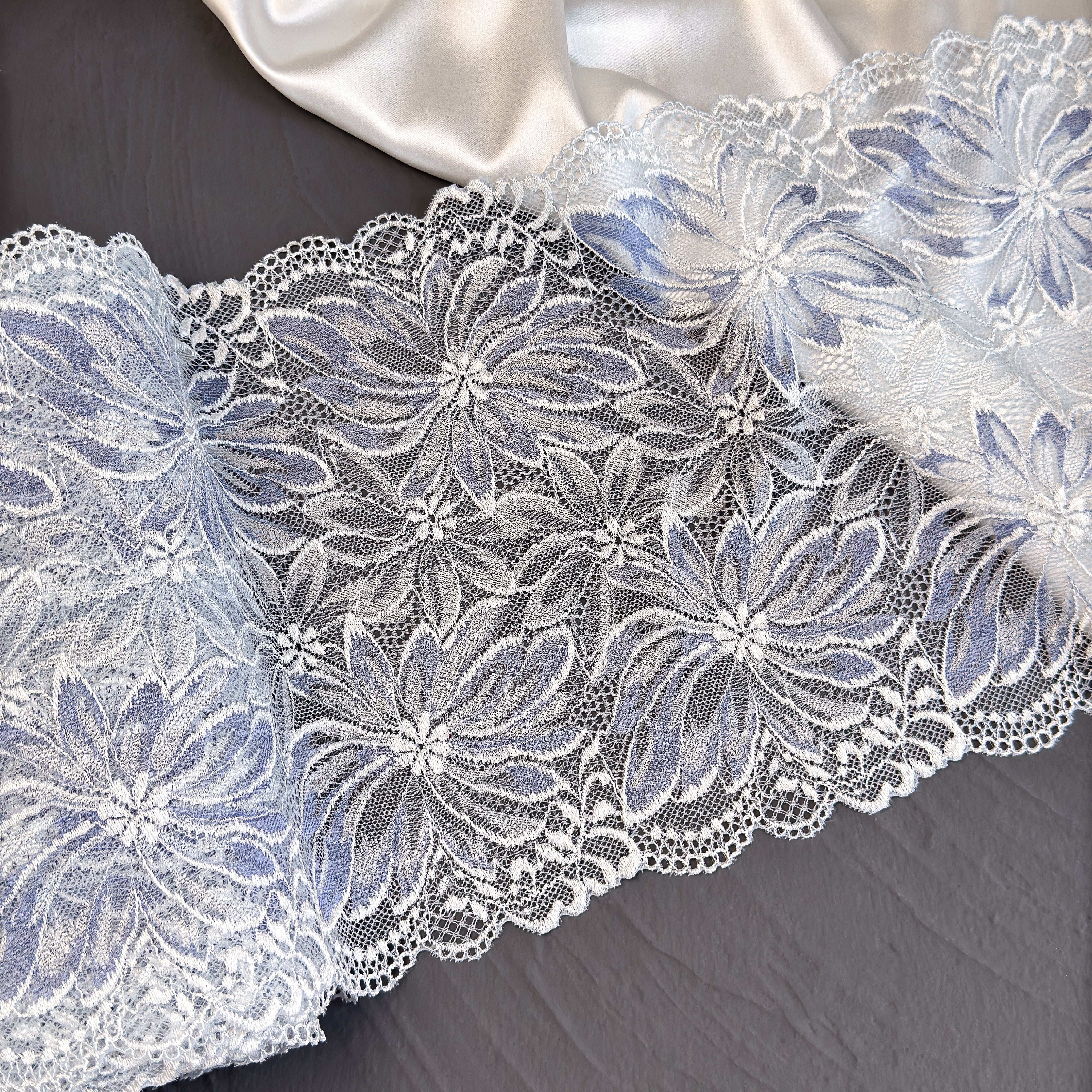 Soft and elegant stretch lace in silver and light blue tones with floral details. Perfect for lingerie sets, bralettes, panties and bridal accents.