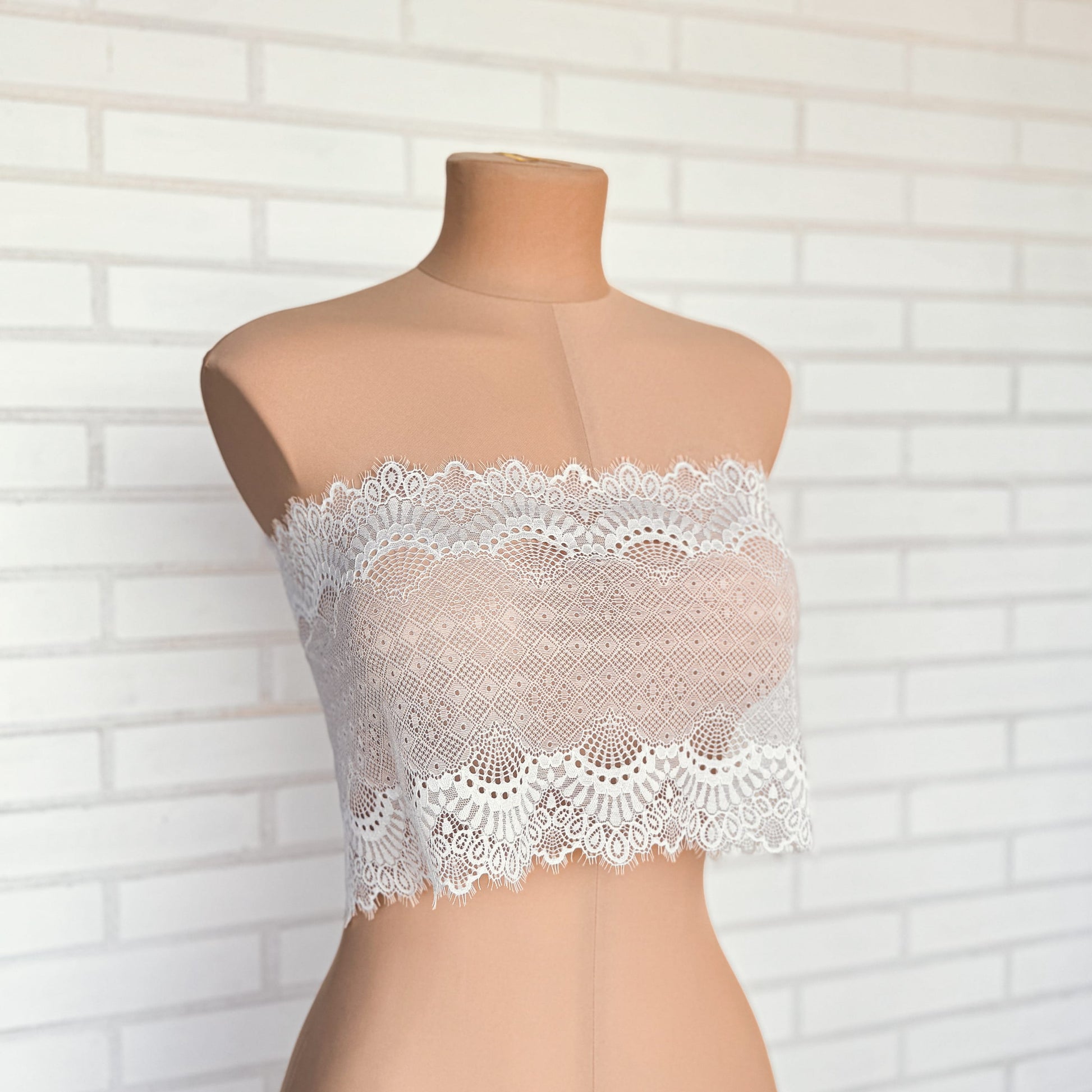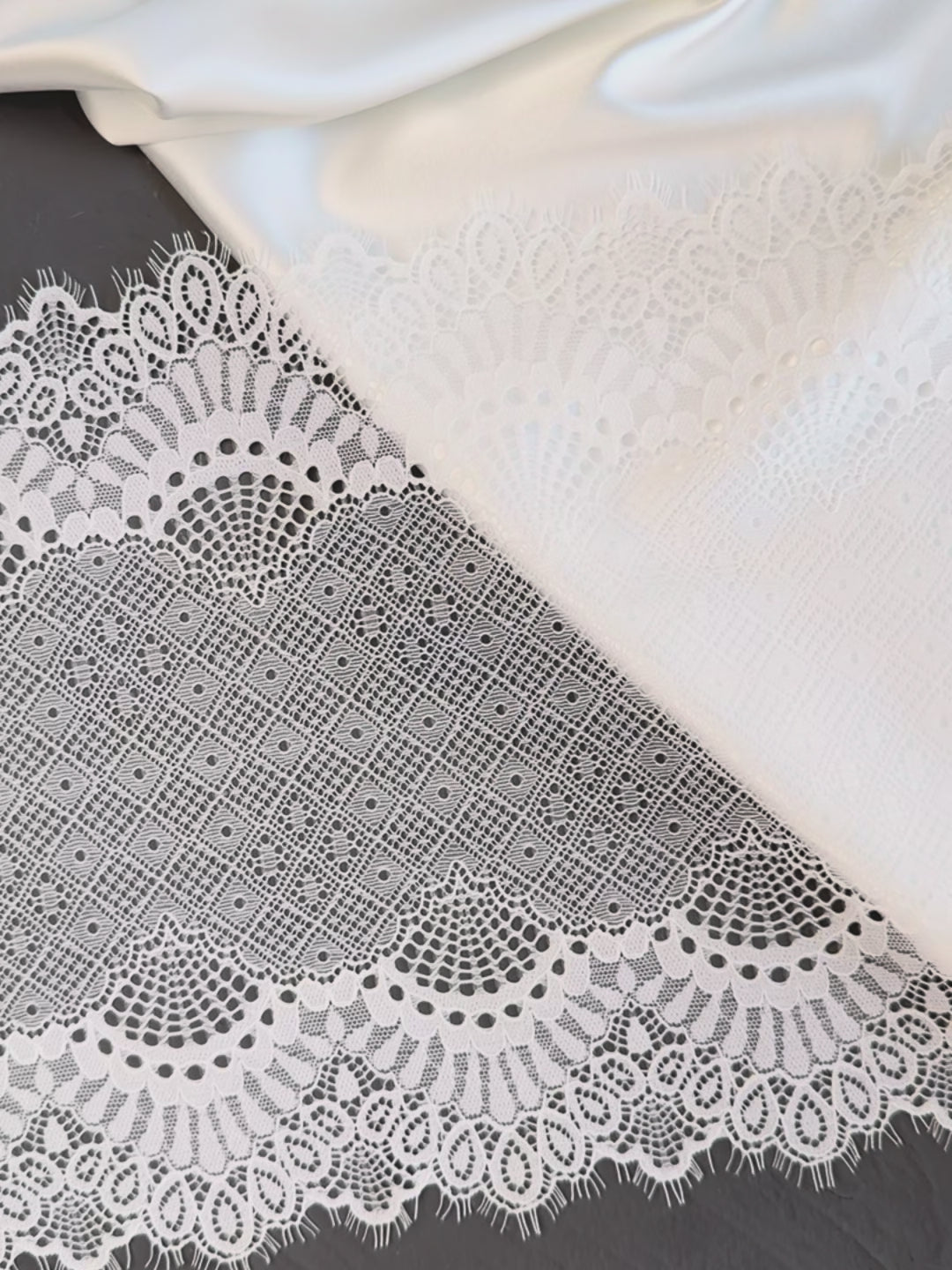 Wide elastic lace trim Off-White with eyelashes. The lace has a unique design, silky to the touch, thin but resilient. Ideal for lingerie crafting, bra making, garment sewing, decor, and other crafts.