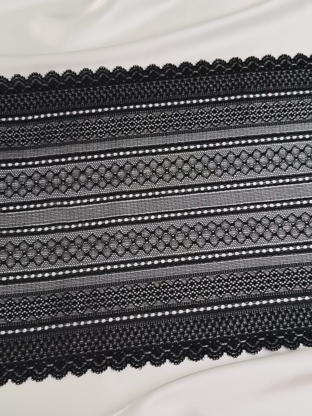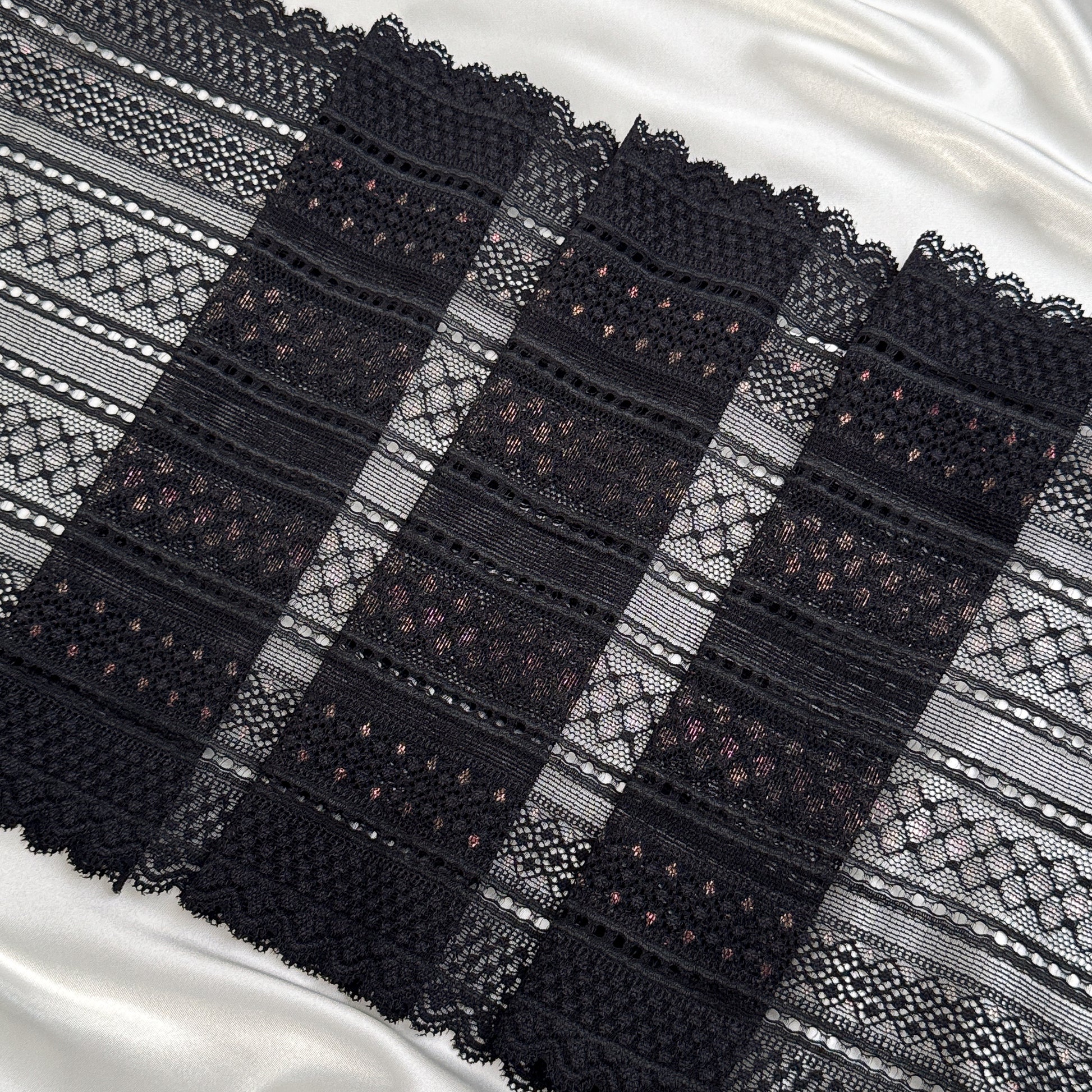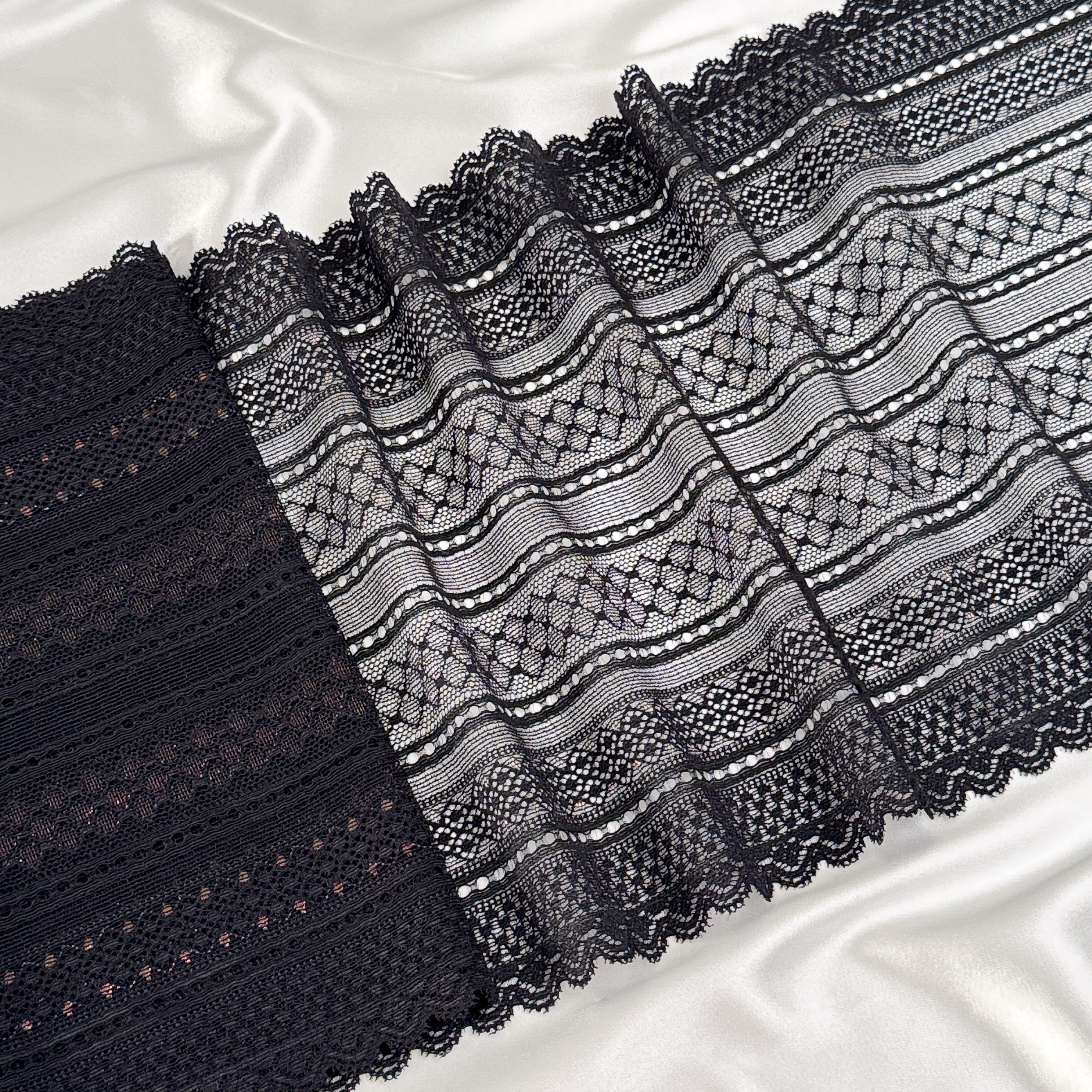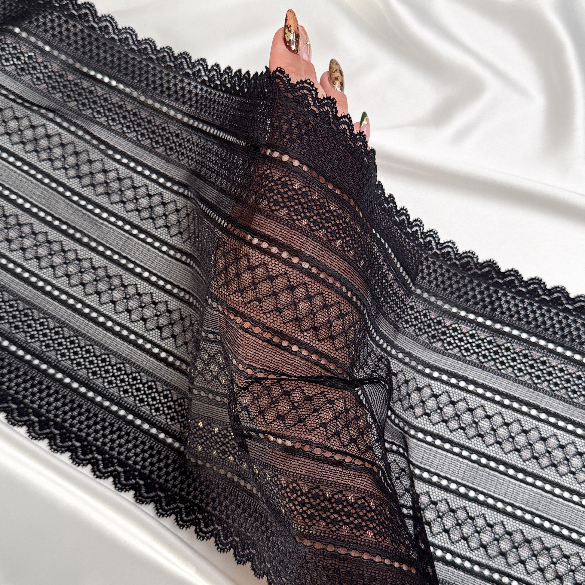 This extra wide elastic lace trim features a structured geometric pattern with delicate lurex threads that add a subtle shimmer in the light. Perfect for statement lingerie pieces, corsetry panels, bodysuits, and wide bra bands.