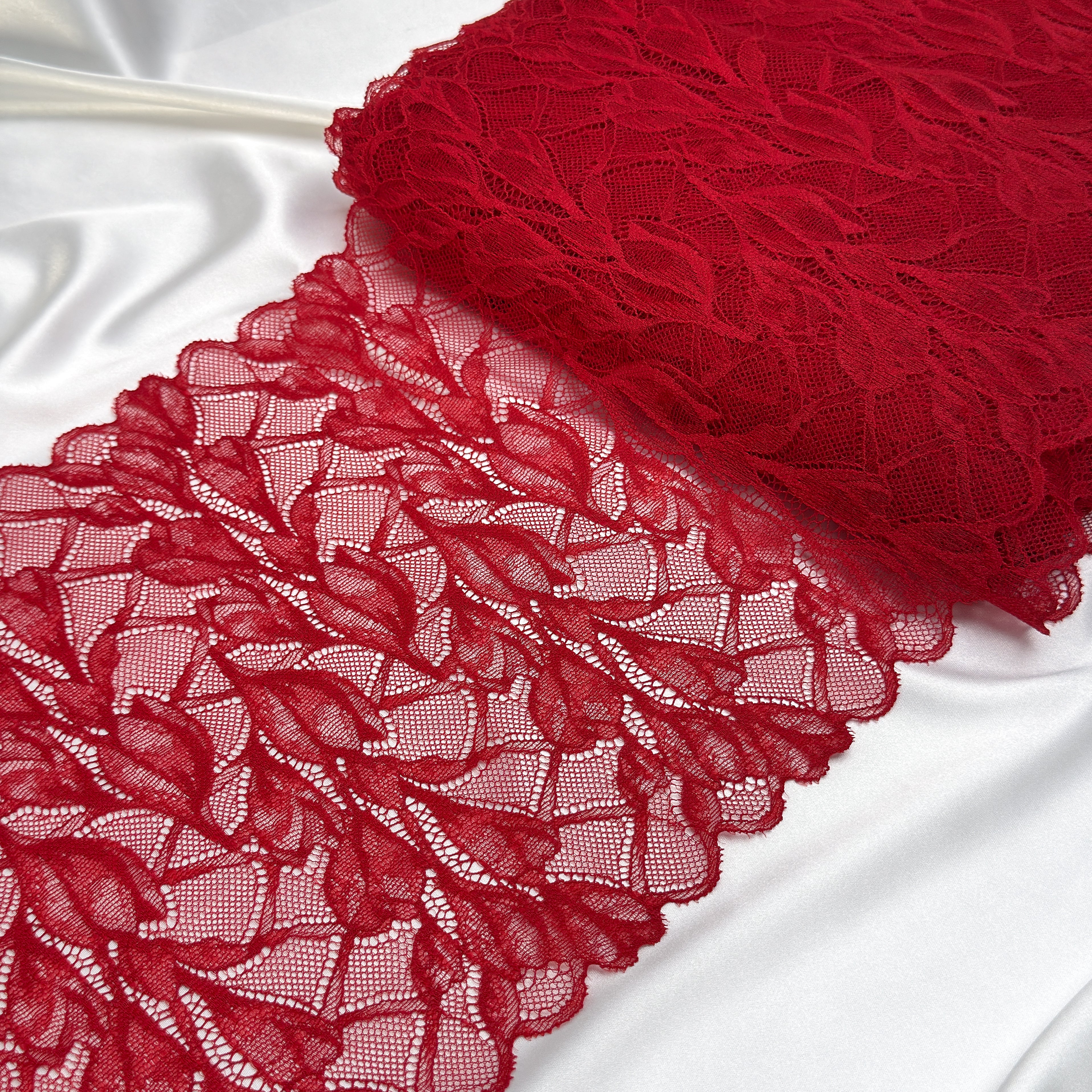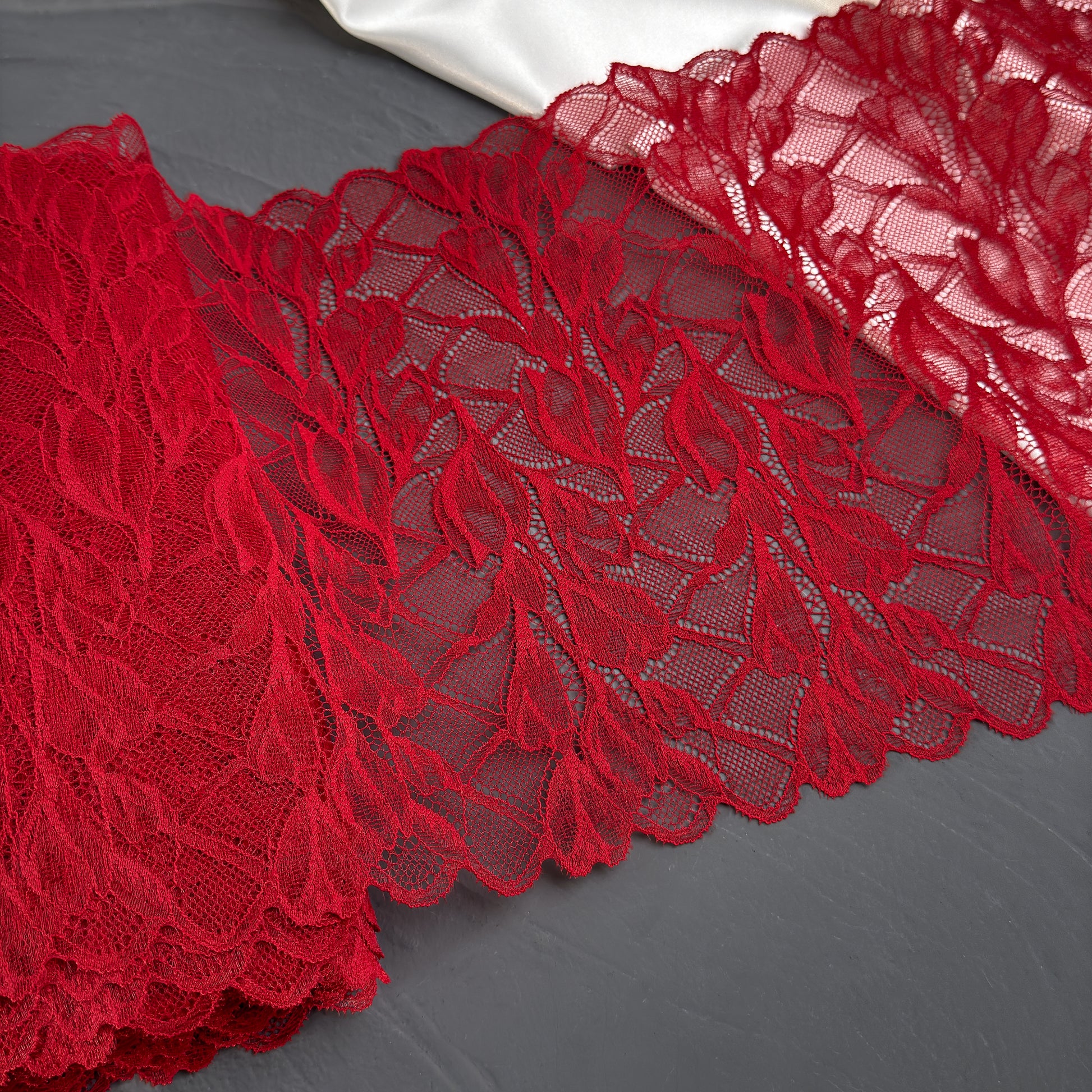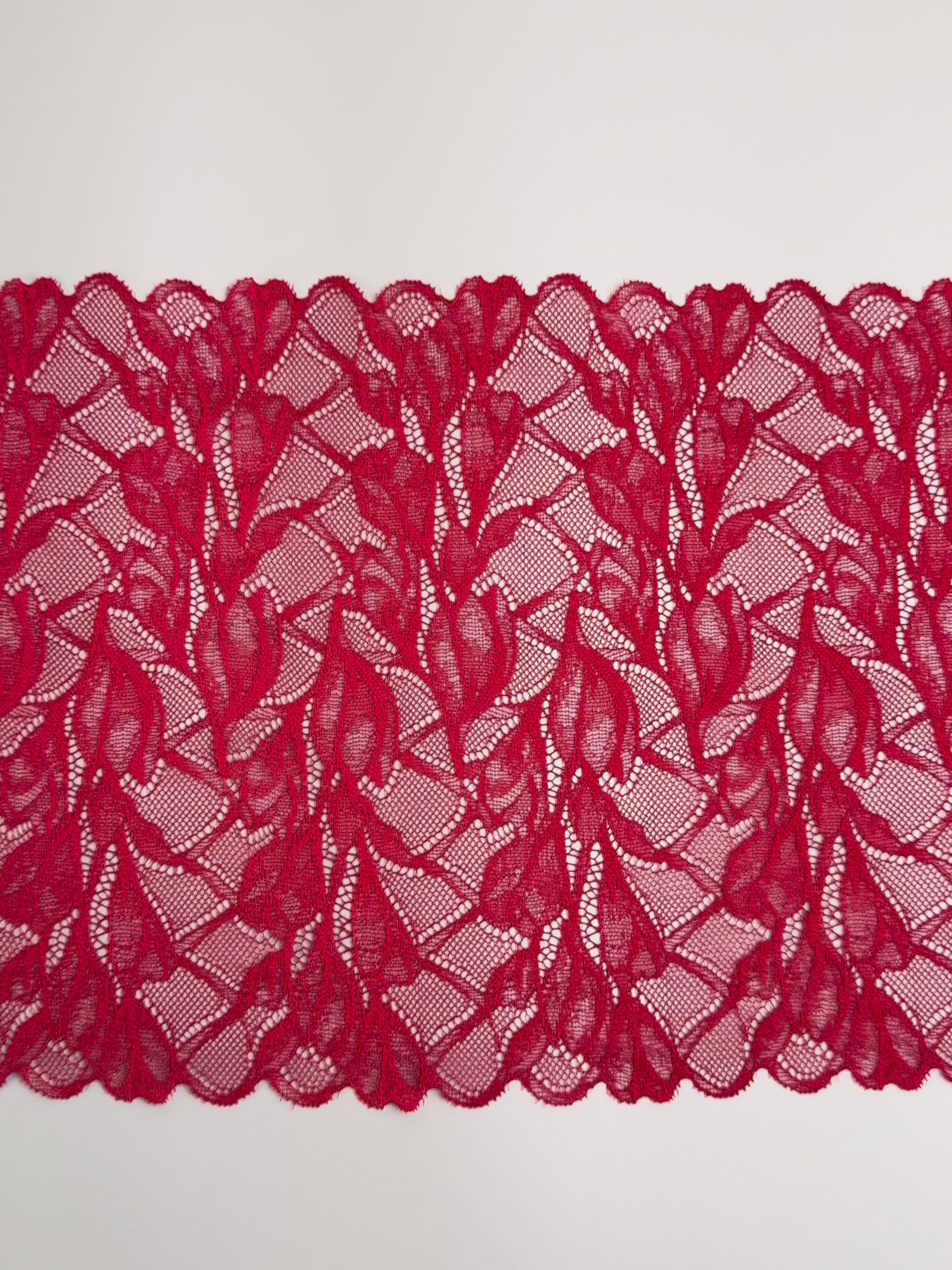 Premium European lace trim in dark red (colour 101), 24 cm wide. Features a large-scale floral motif and a stable, low-stretch structure, making it perfect for bra making, lingerie sewing, and other intimate apparel projects requiring broader lace width.