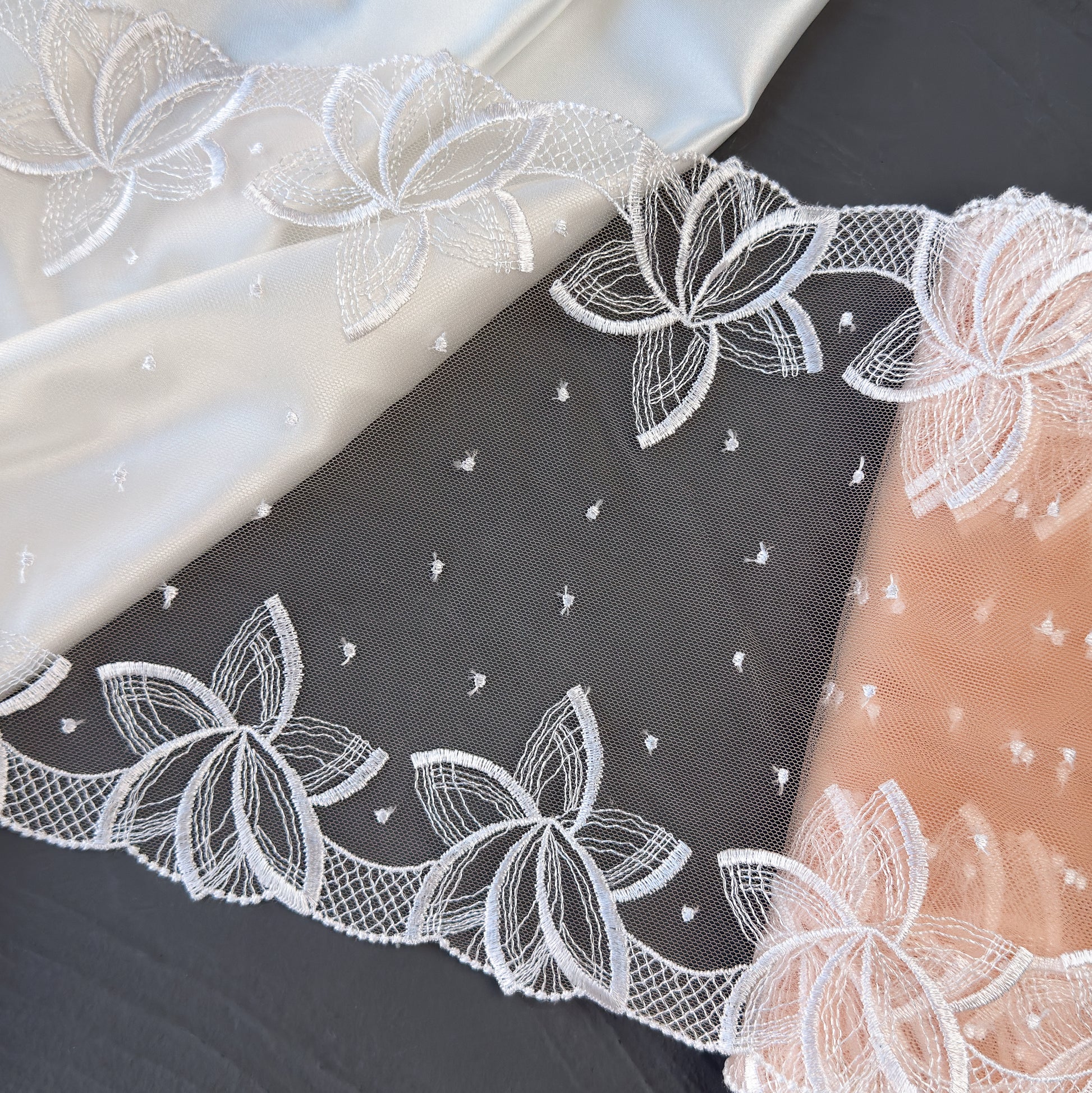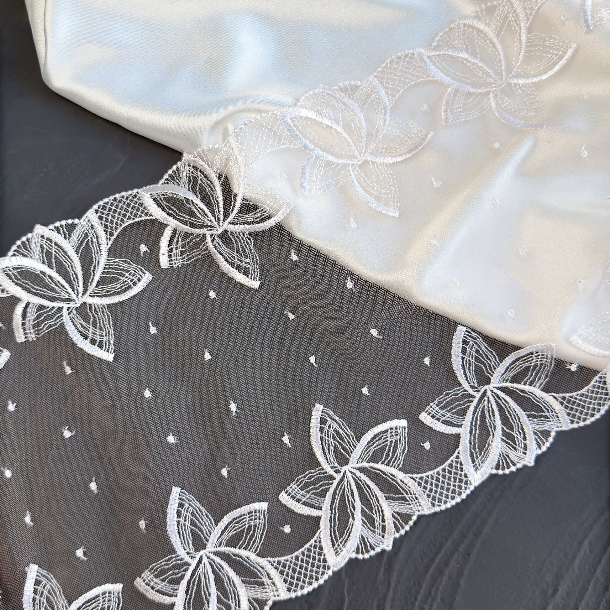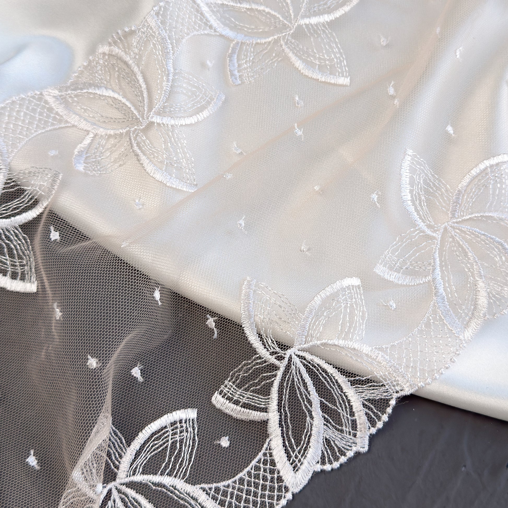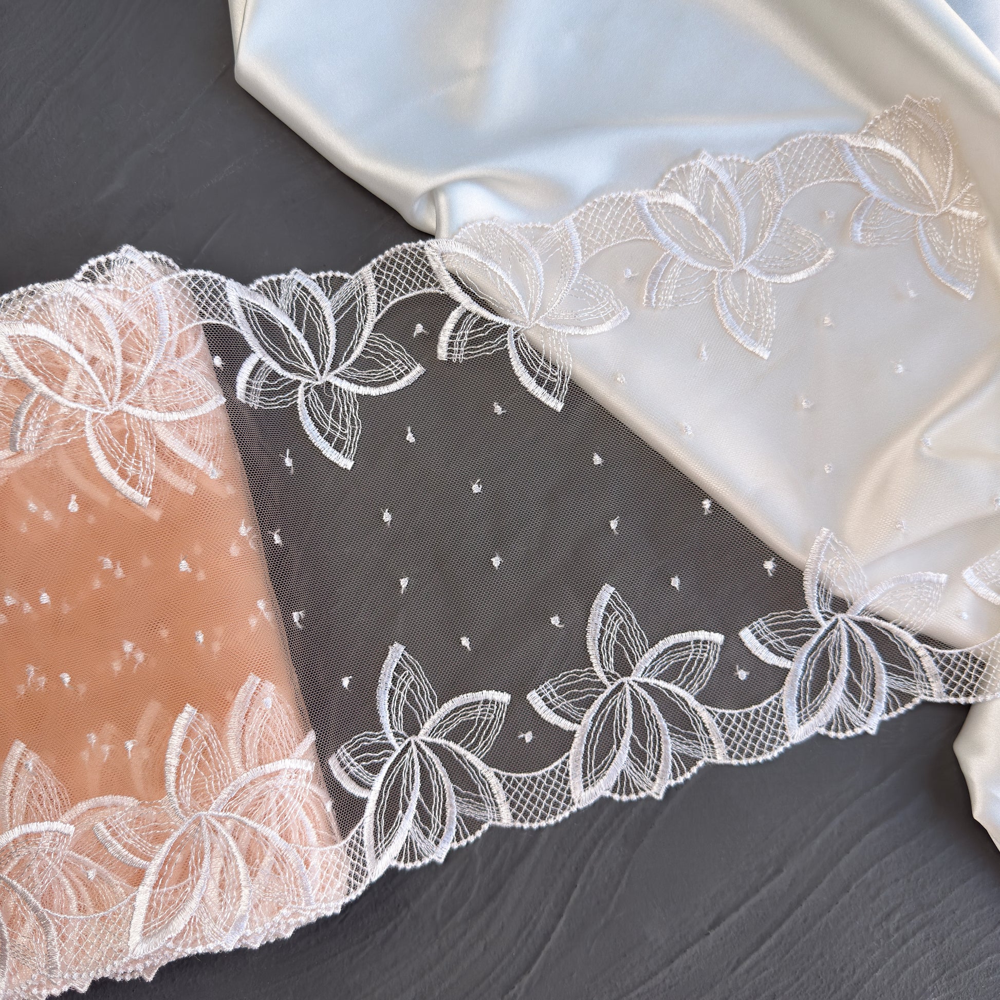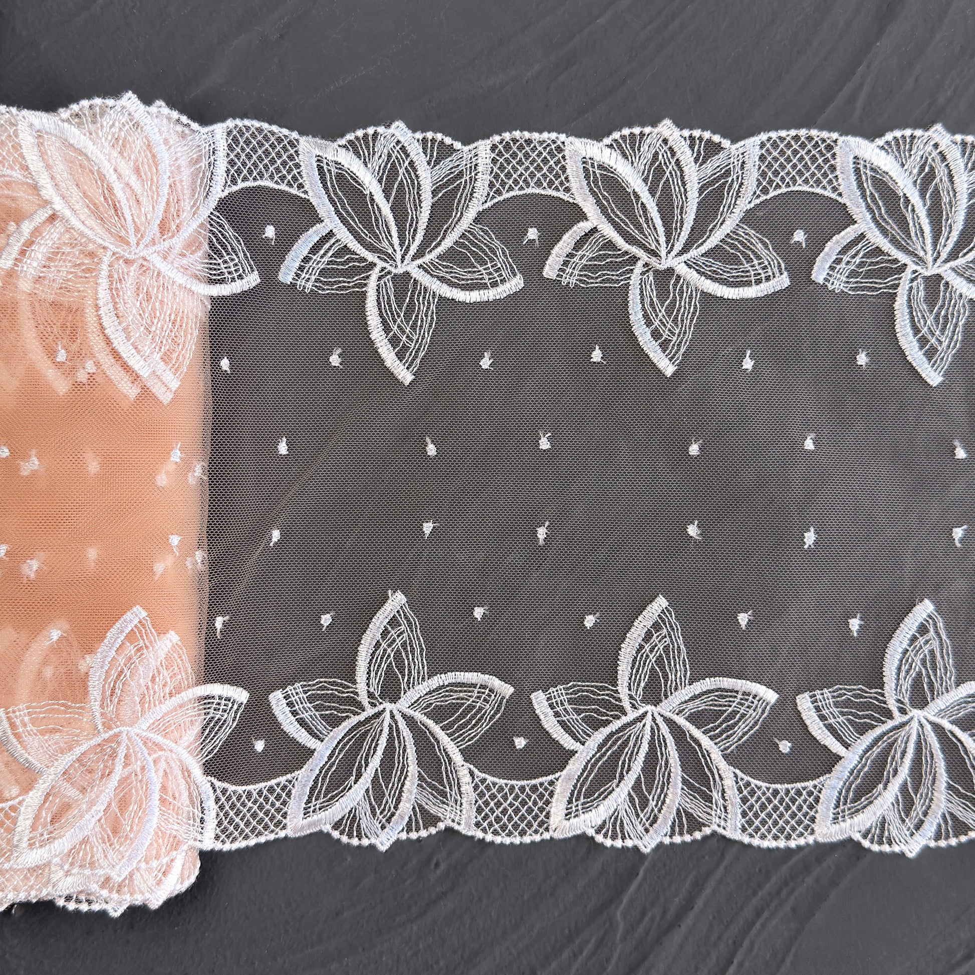 White embroidery on beige mesh with floral pattern. Ideal for lingerie sewing, bra making, garment sewing, decor, and other crafts.
