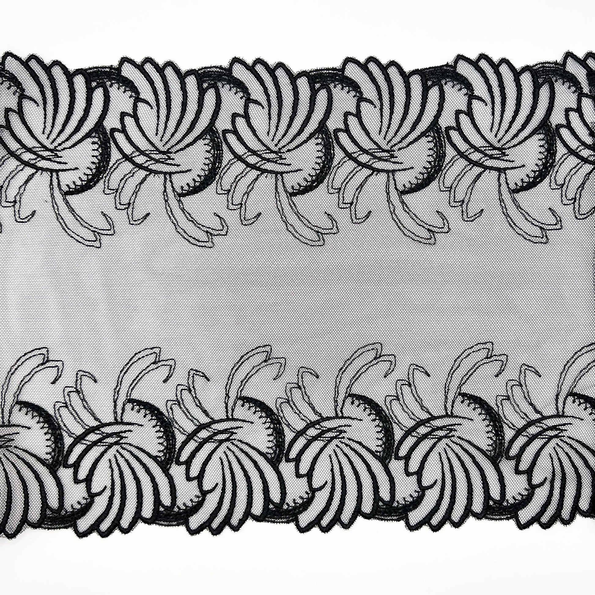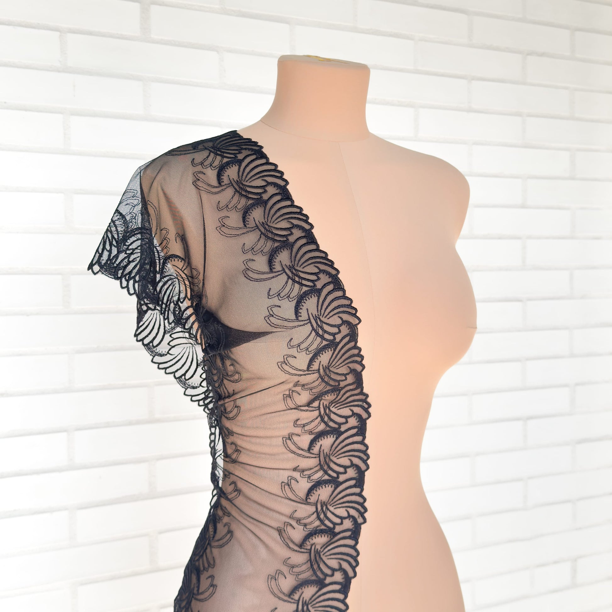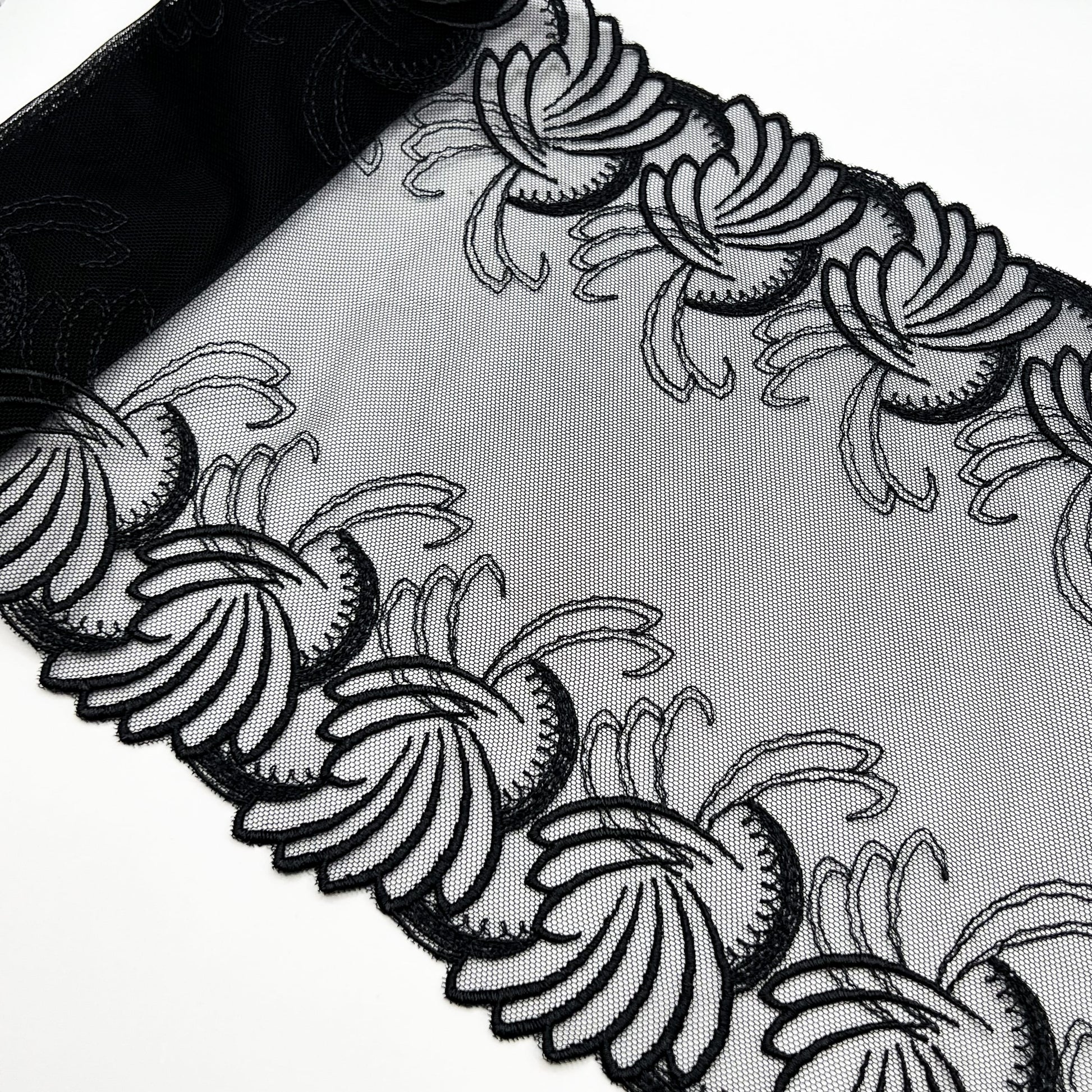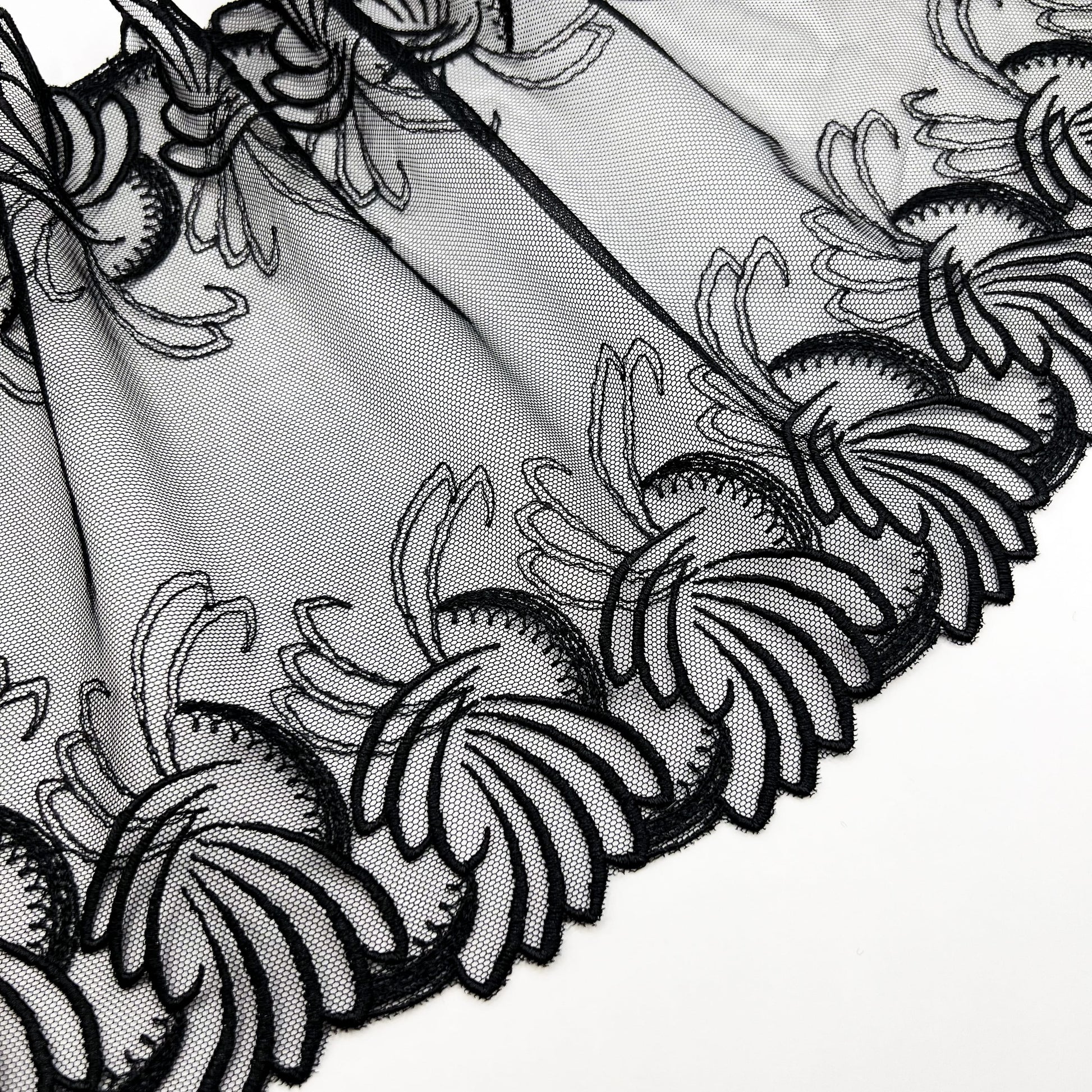 Black embroidery on a soft non-elastic tulle. Ideal for lingerie sewing, bra making, garment sewing, decor, and other crafts.
