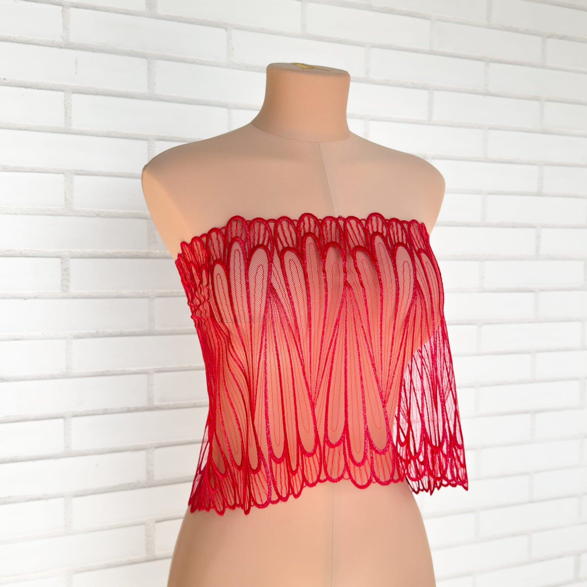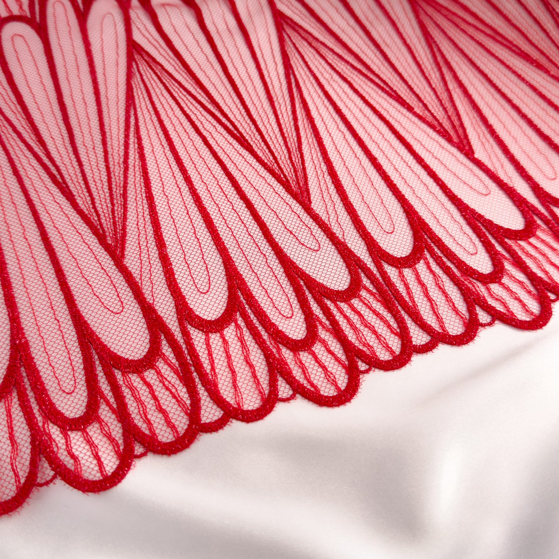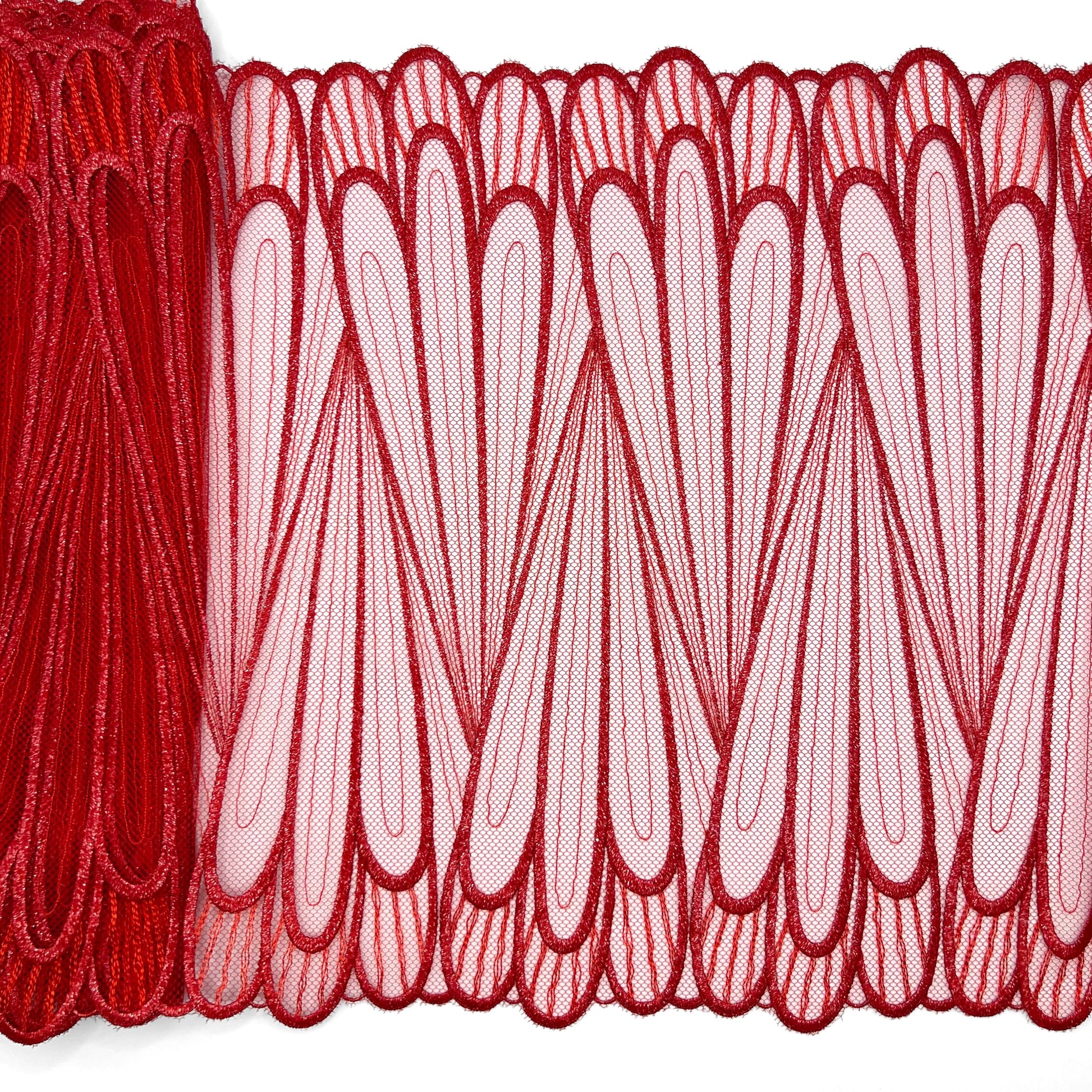 Extra-wide dark red geometric embroidered lace, 30cm in width, crafted from soft tulle. This lace features a barely noticeable lurex thread, adding a subtle shimmering effect for an elegant touch. Perfect for lingerie sewing, corset making, bra crafting, garment decoration, and other creative DIY projects.