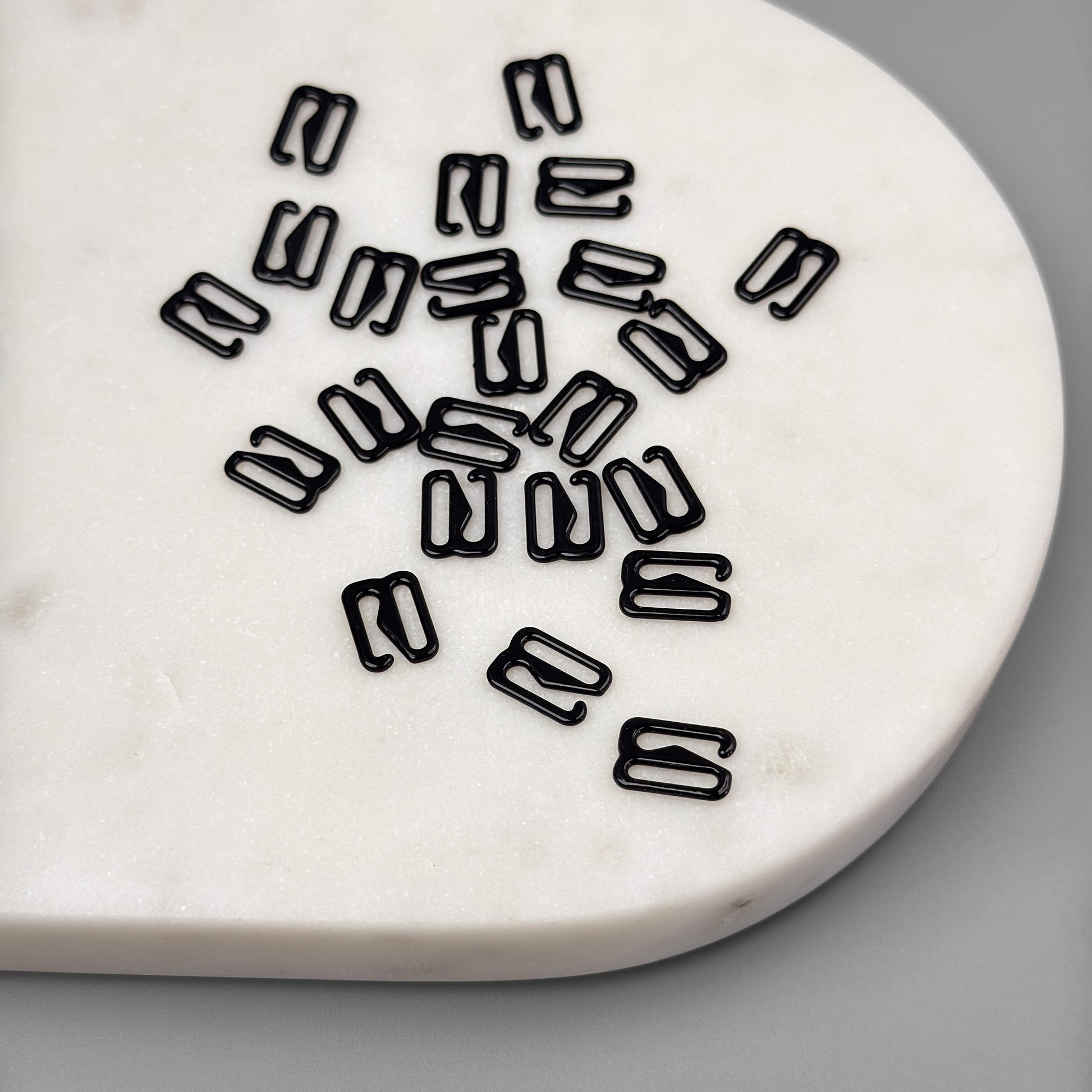 These 10mm black nylon-coated hooks are perfect for secure and adjustable connections in lingerie and activewear. Crafted from nickel-free metal with a durable nylon coating, these hooks offer a sleek matte finish and enhanced resistance to wear, making them ideal for high-quality designs.