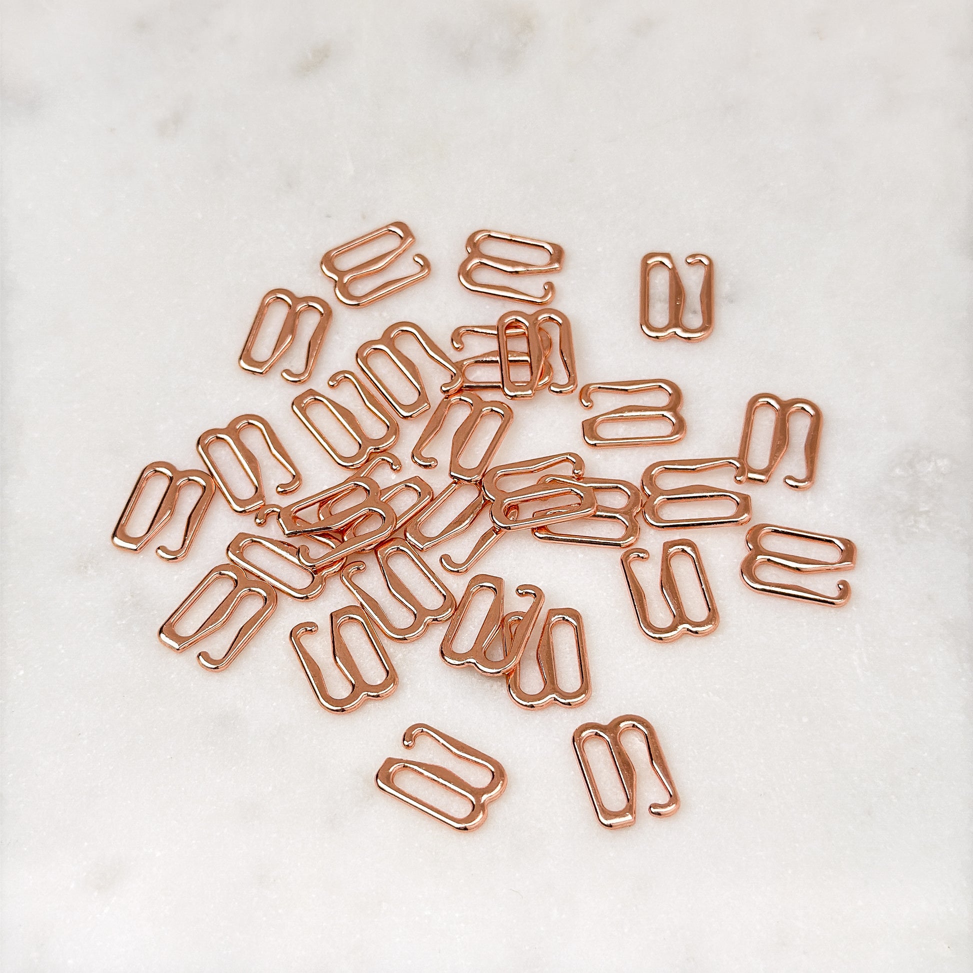 Add a touch of elegance and functionality to your lingerie and swimwear creations with these 10mm rose gold-plated G-hooks! Crafted from high-quality, nickel-free metal, these hooks are designed to provide a secure and adjustable fit. The polished rose gold finish resists tarnishing, even when exposed to chlorine and salt water, making them ideal for high-quality, long-lasting designs.