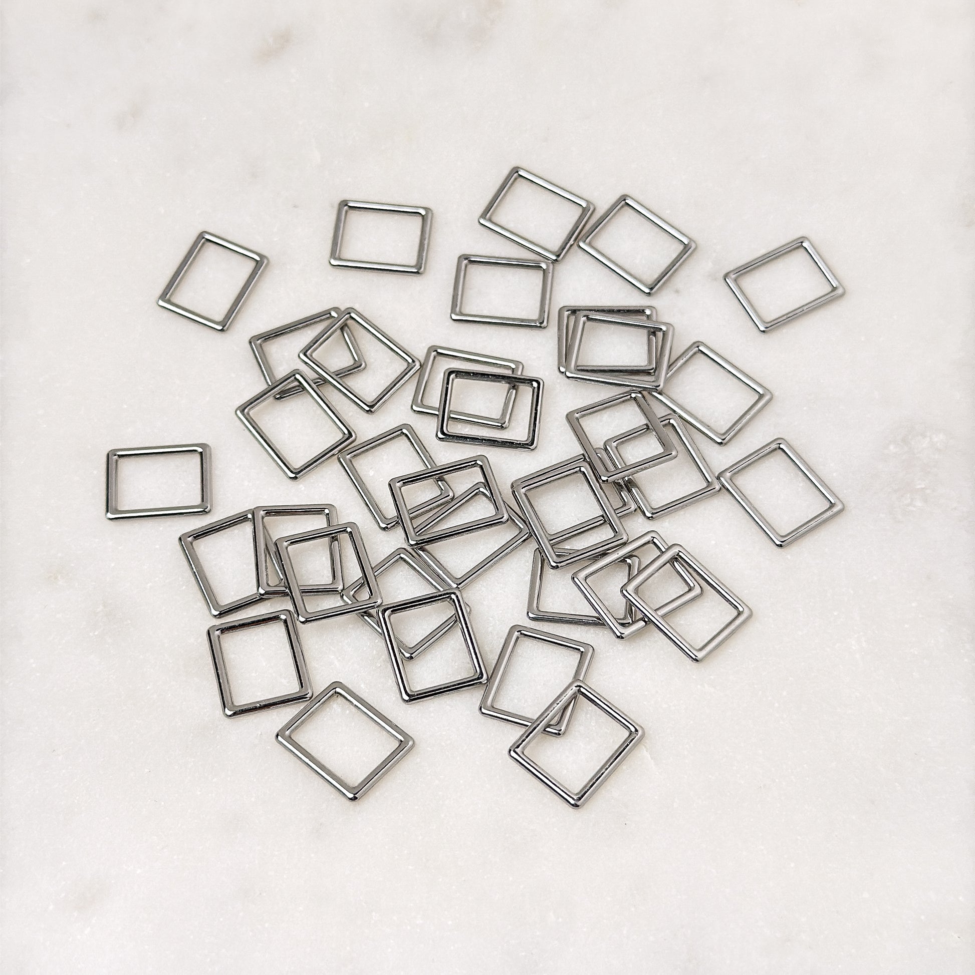 These 10mm square silver-plated rings bring a modern, sleek touch to lingerie designs. Made from high-quality, nickel-free metal, they feature a durable silver finish, adding a chic, geometric accent to straps, bands, and other lingerie elements.