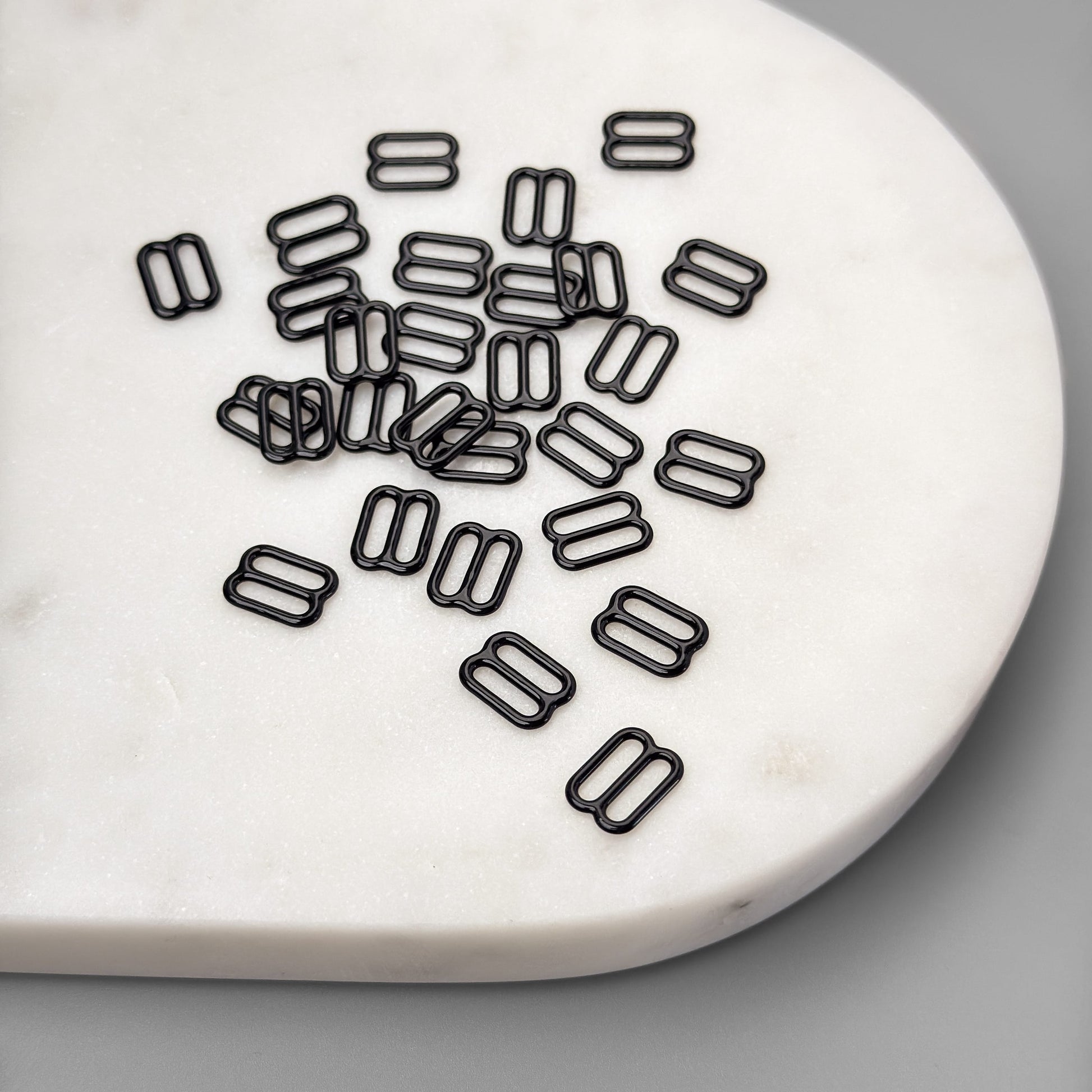 These 10mm black nylon-coated sliders are perfect for creating adjustable and secure straps in lingerie and sportswear. Made from durable, nickel-free metal with a smooth nylon coating, they offer a matte finish and enhanced resistance against scratches and wear, making them ideal for high-quality, long-lasting projects.