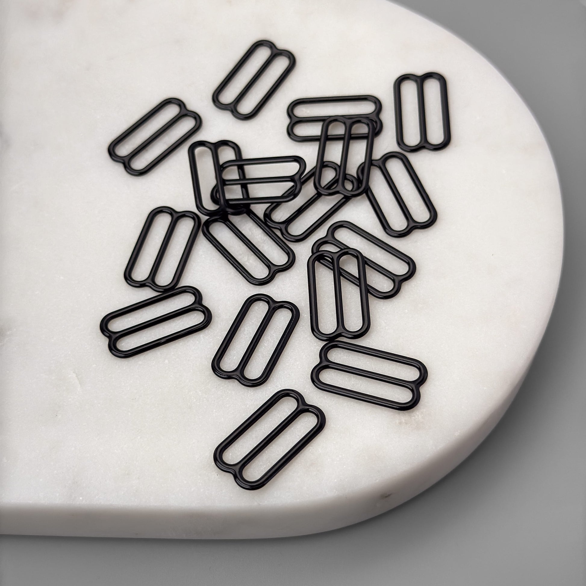 These 20mm black nylon-coated sliders are perfect for creating adjustable and secure straps in lingerie and sportswear. Made from durable, nickel-free metal with a smooth nylon coating, they offer a matte finish and enhanced resistance against scratches and wear, making them ideal for high-quality, long-lasting projects.