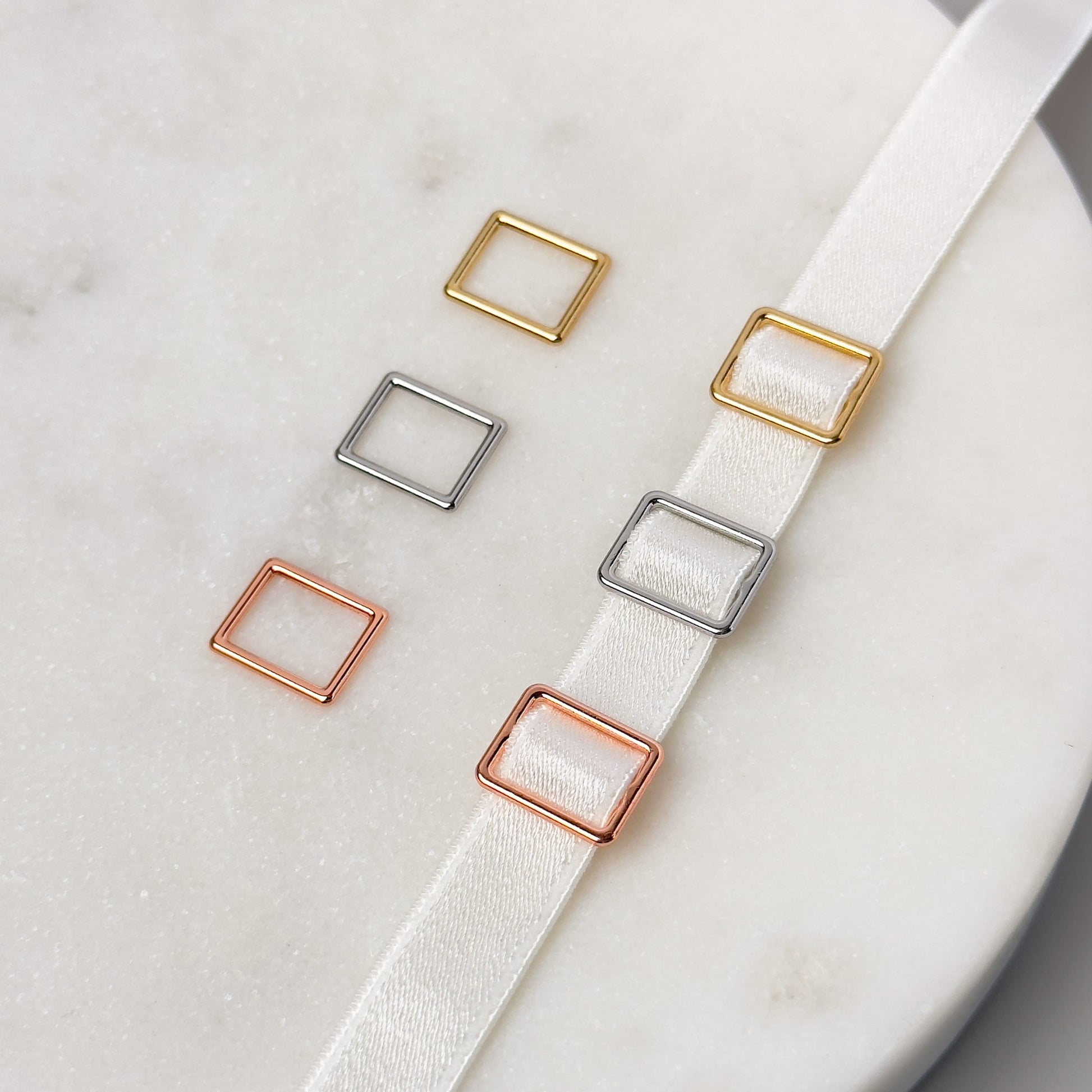 These 10mm square gold-plated sliders are ideal for creating adjustable straps in lingerie. Made from durable, nickel-free metal, these sliders feature a polished gold finish, adding a modern and sophisticated touch to intimate apparel. Perfect for achieving a secure and stylish fit.