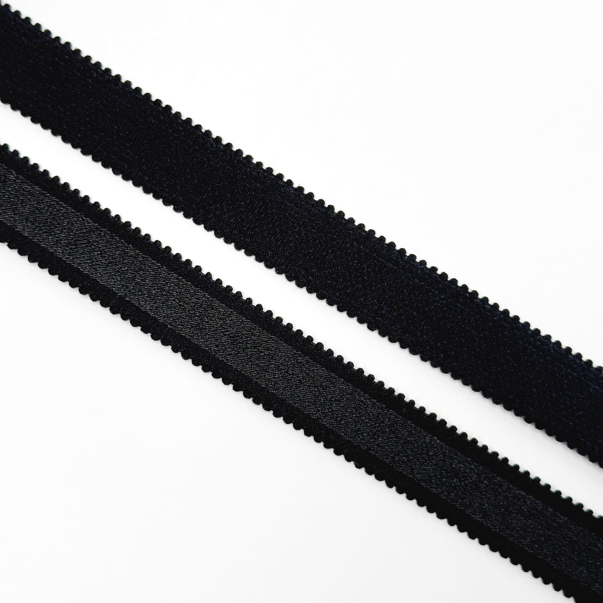 Strap elastic from Lauma with a glossy stripe. The outside has a glossy stripe, and the inside is matte. Both edges feature small scalloped teeth, giving it an elegant look. It has medium elasticity. Tactilely pleasant, it is perfect for creating comfortable lingerie.