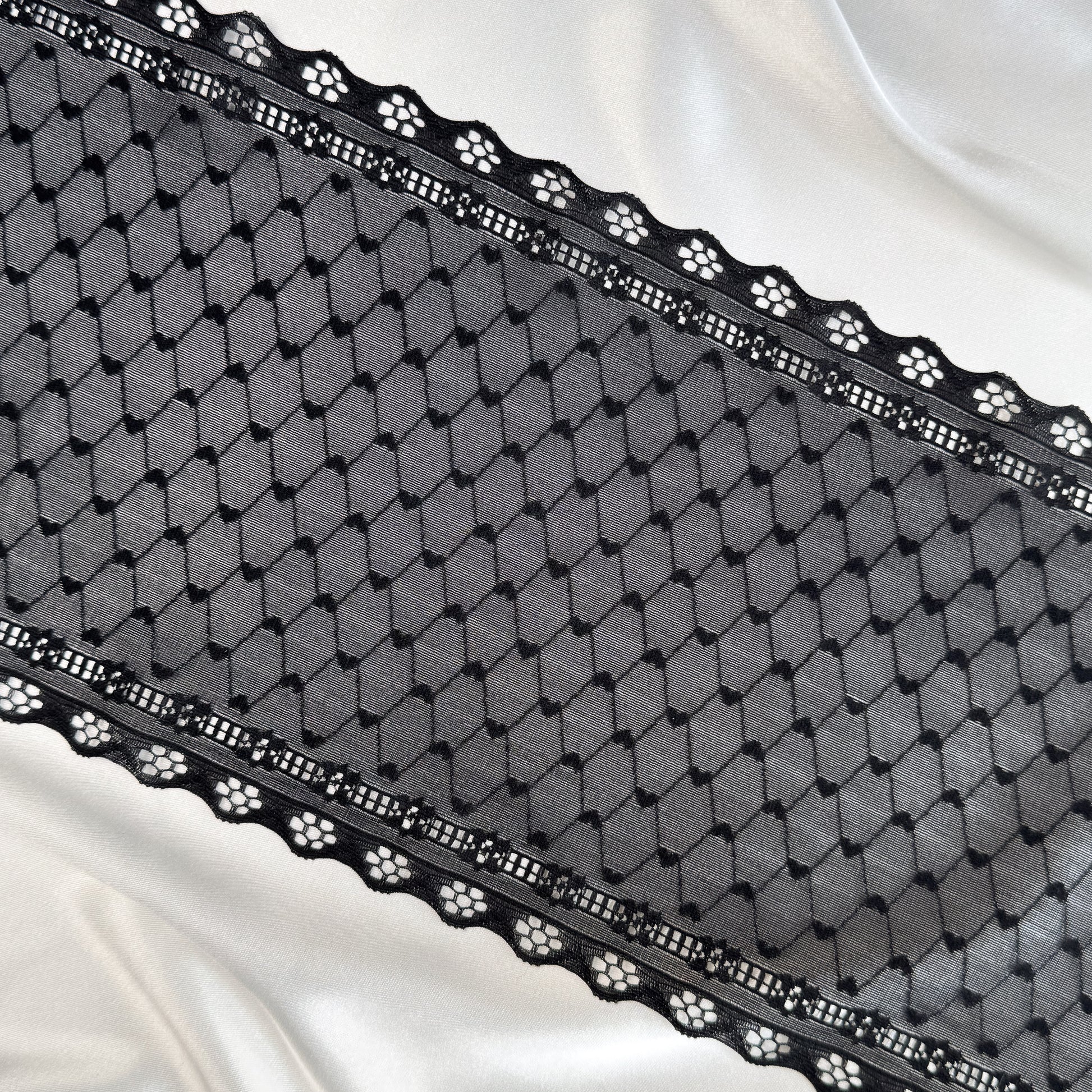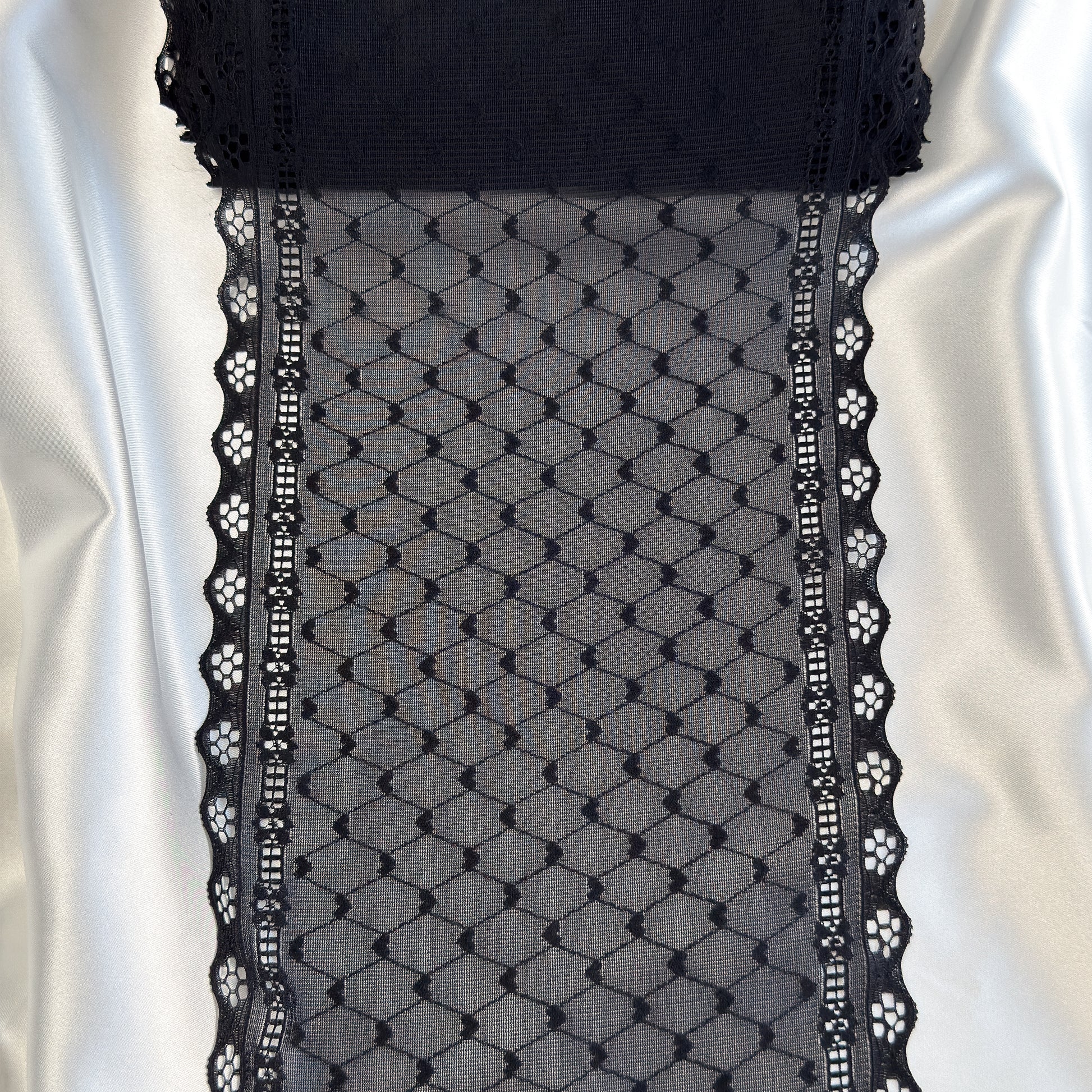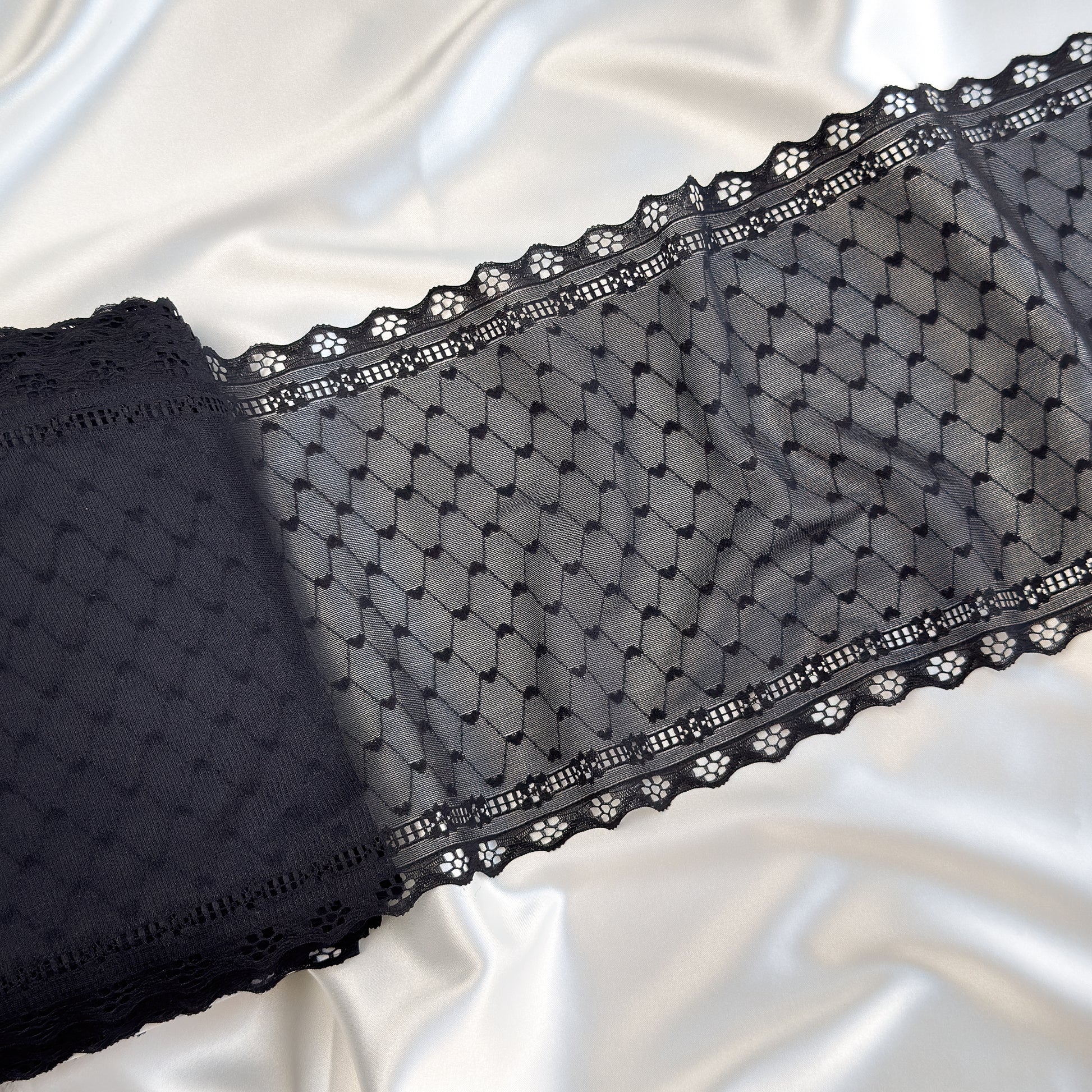 Black heart-patterned lace mesh, stretchable for lingerie and garment crafting. Durable and designed for comfort, it's ideal for intimate apparel and creative sewing projects