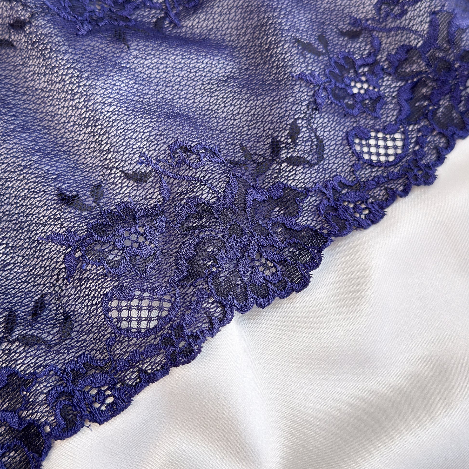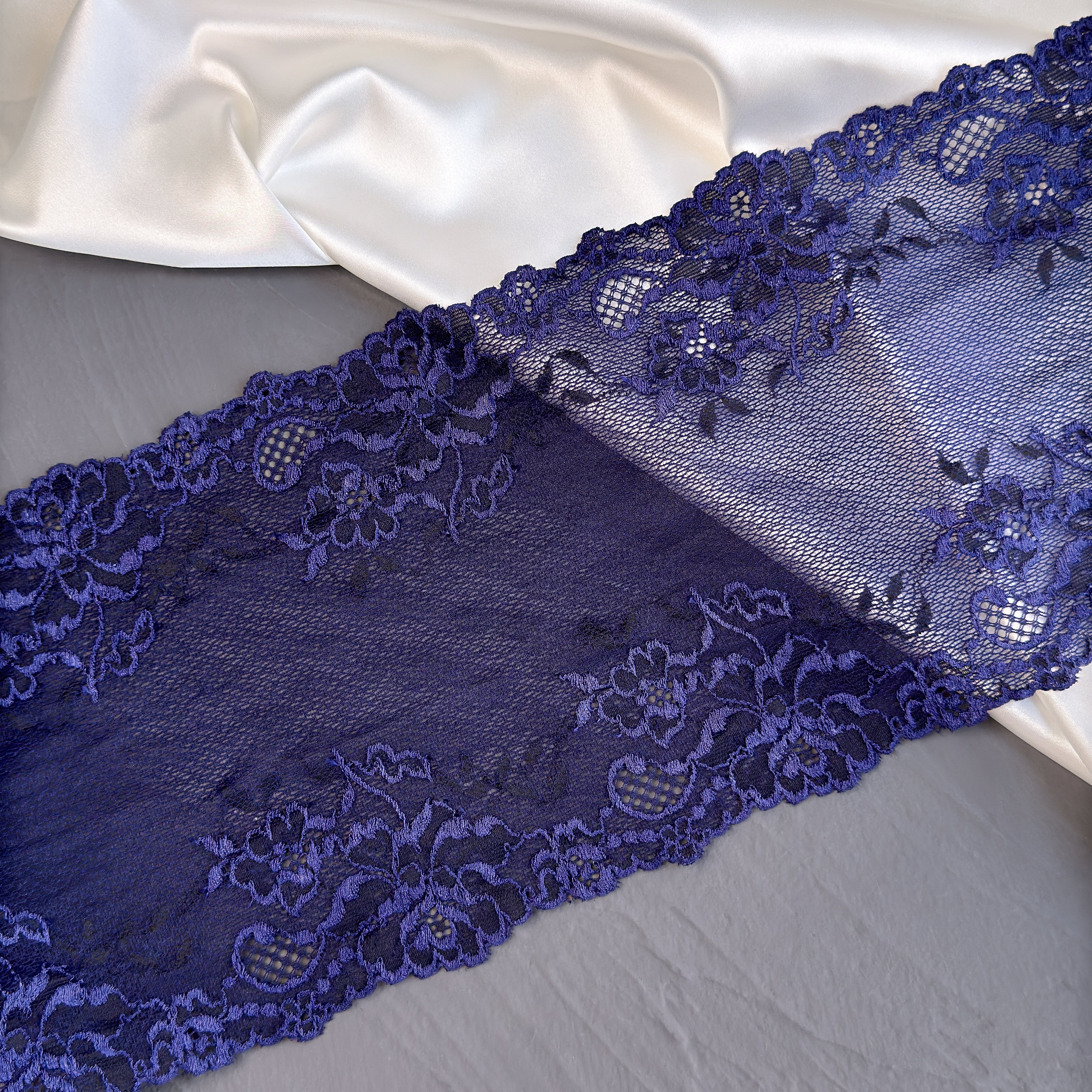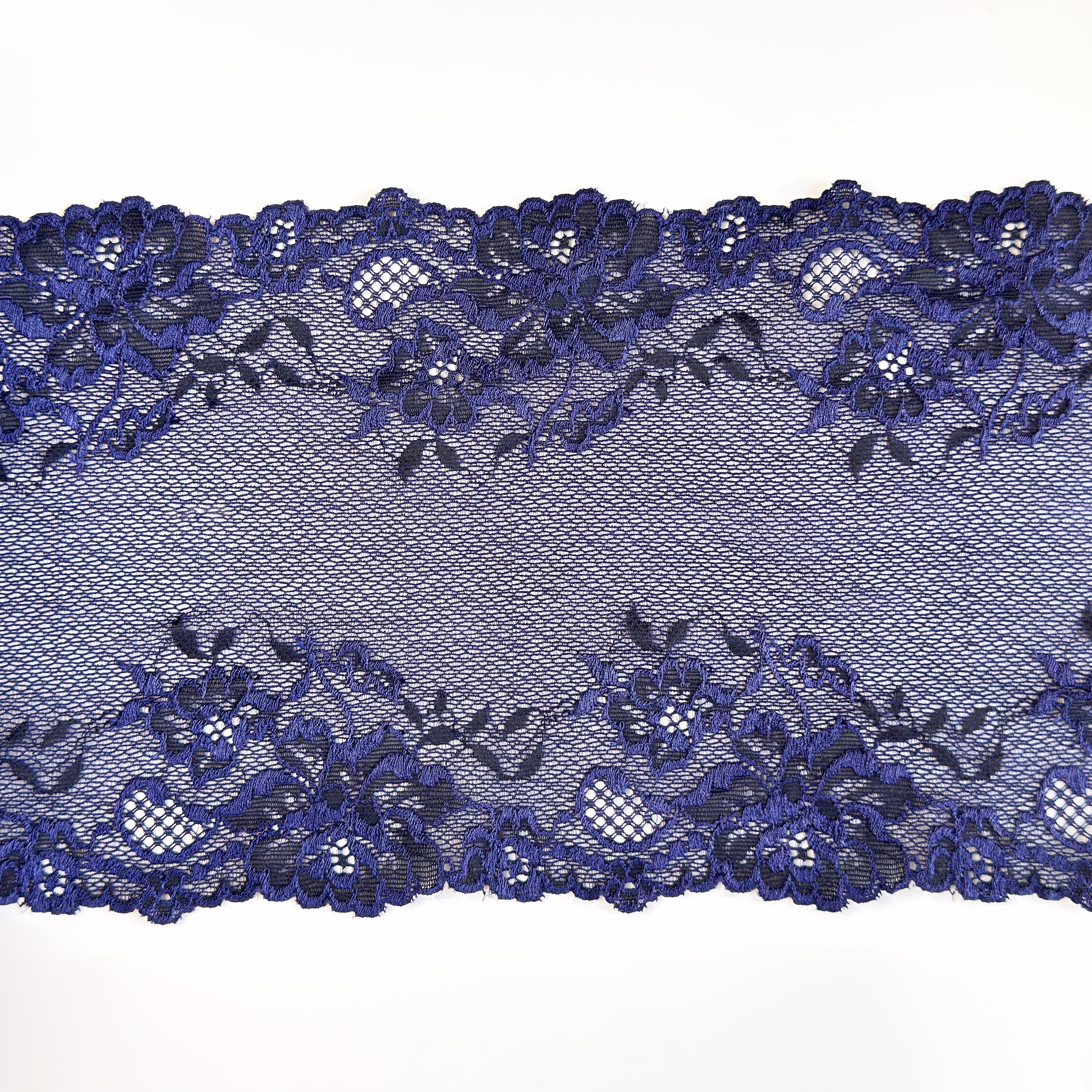 Dark Blue elastic lace trim combined with black color. This lace, made in Europe, offers a unique blend of aesthetics and texture. Ideal for lingerie crafting, bra making, garment sewing, decor, and other crafts.