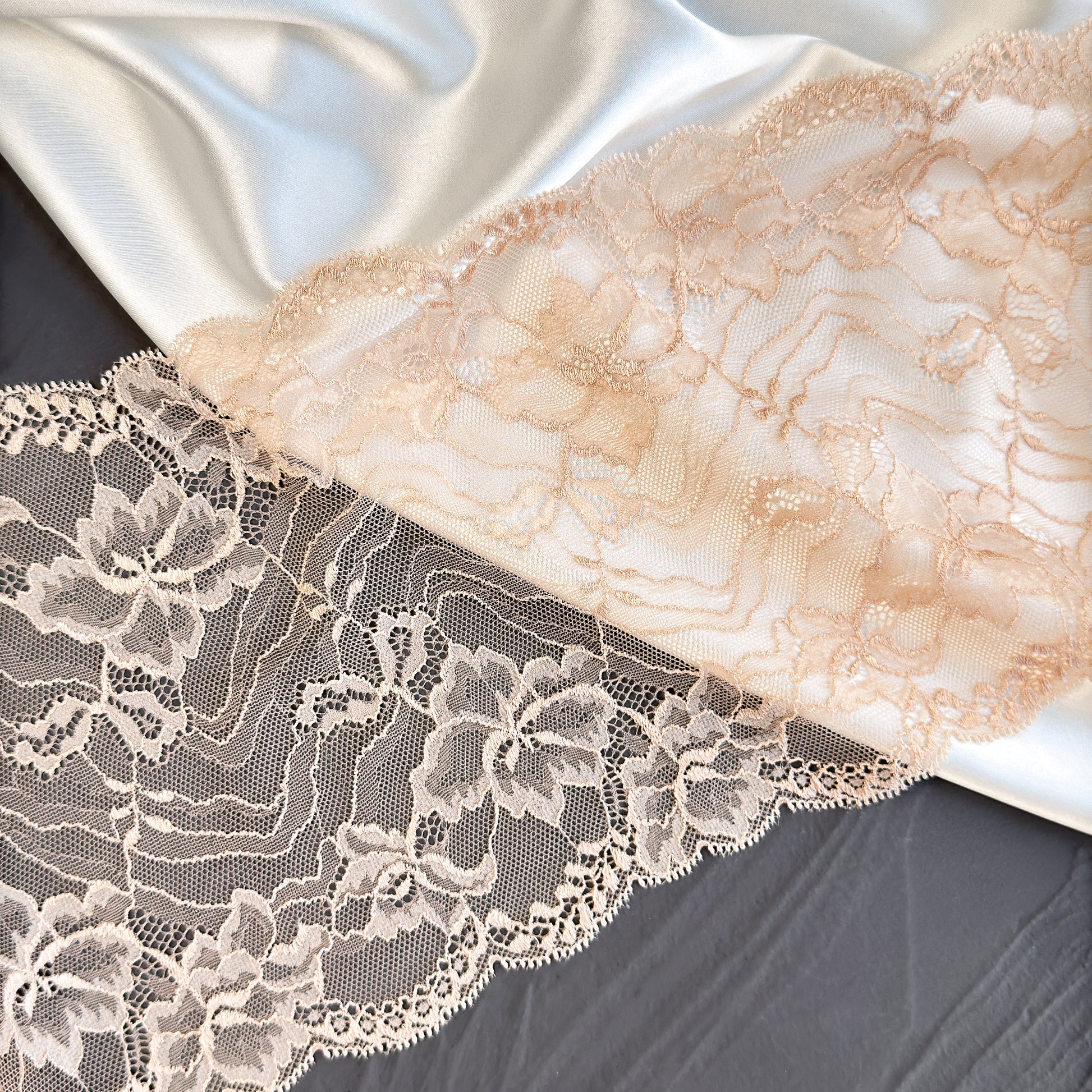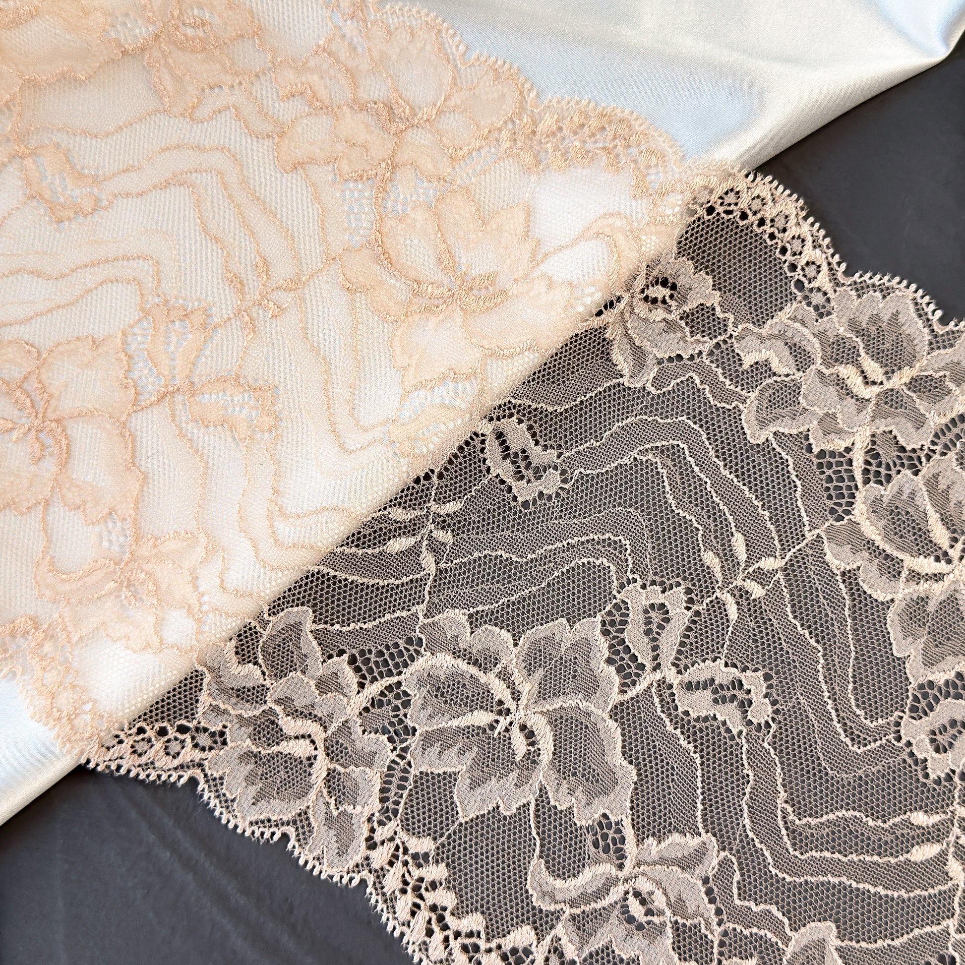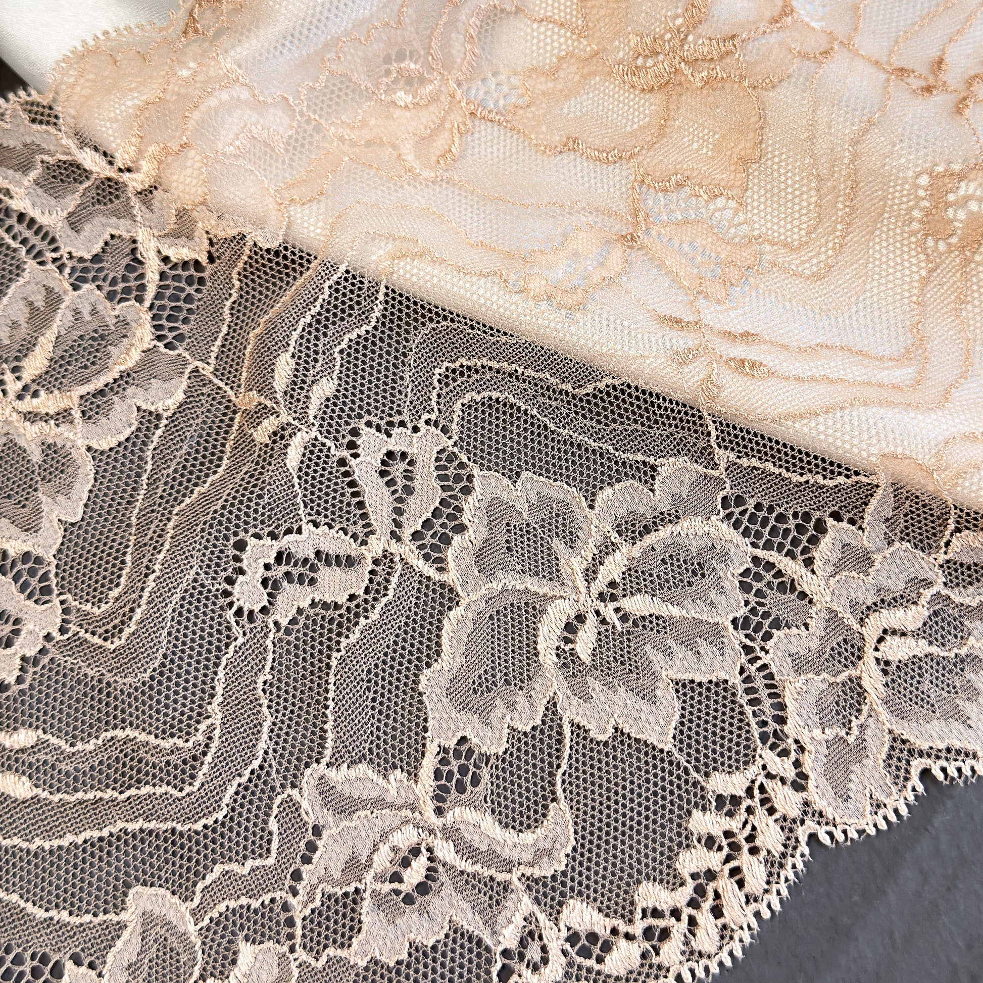 Delicate stretch lace in a beige-nude tone — ideal for lingerie sets, bralettes, panties, and refined details in lingerie sewing.