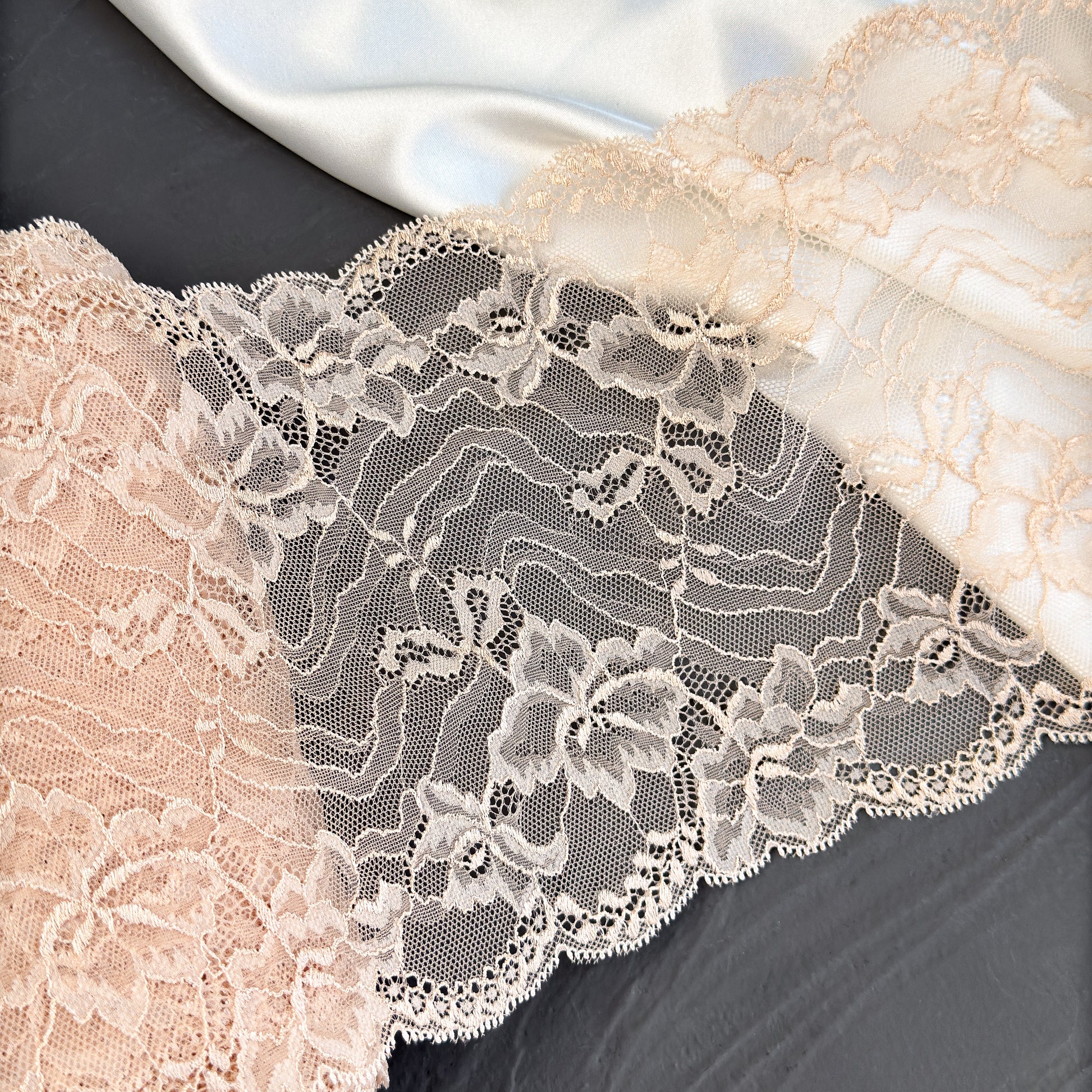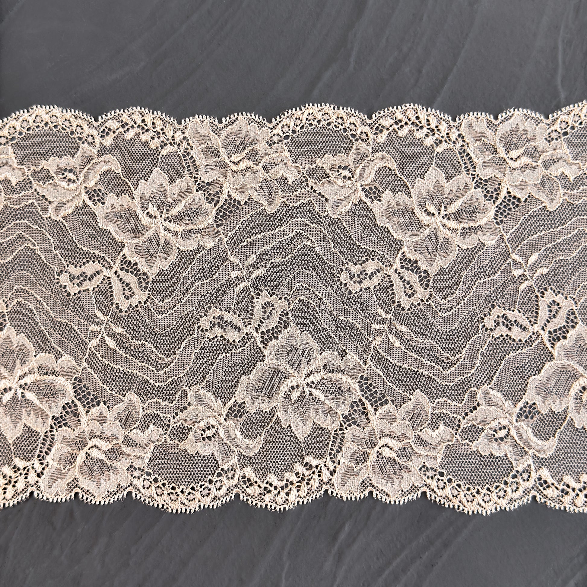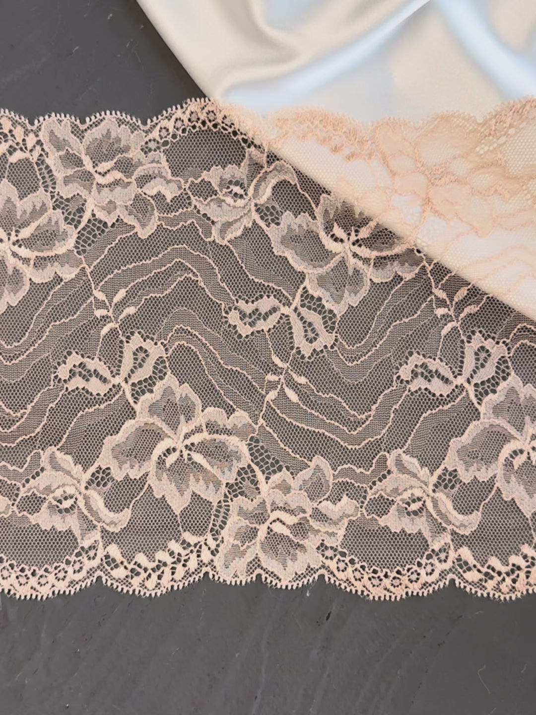 Delicate stretch lace in a beige-nude tone — ideal for lingerie sets, bralettes, panties, and refined details in lingerie sewing.