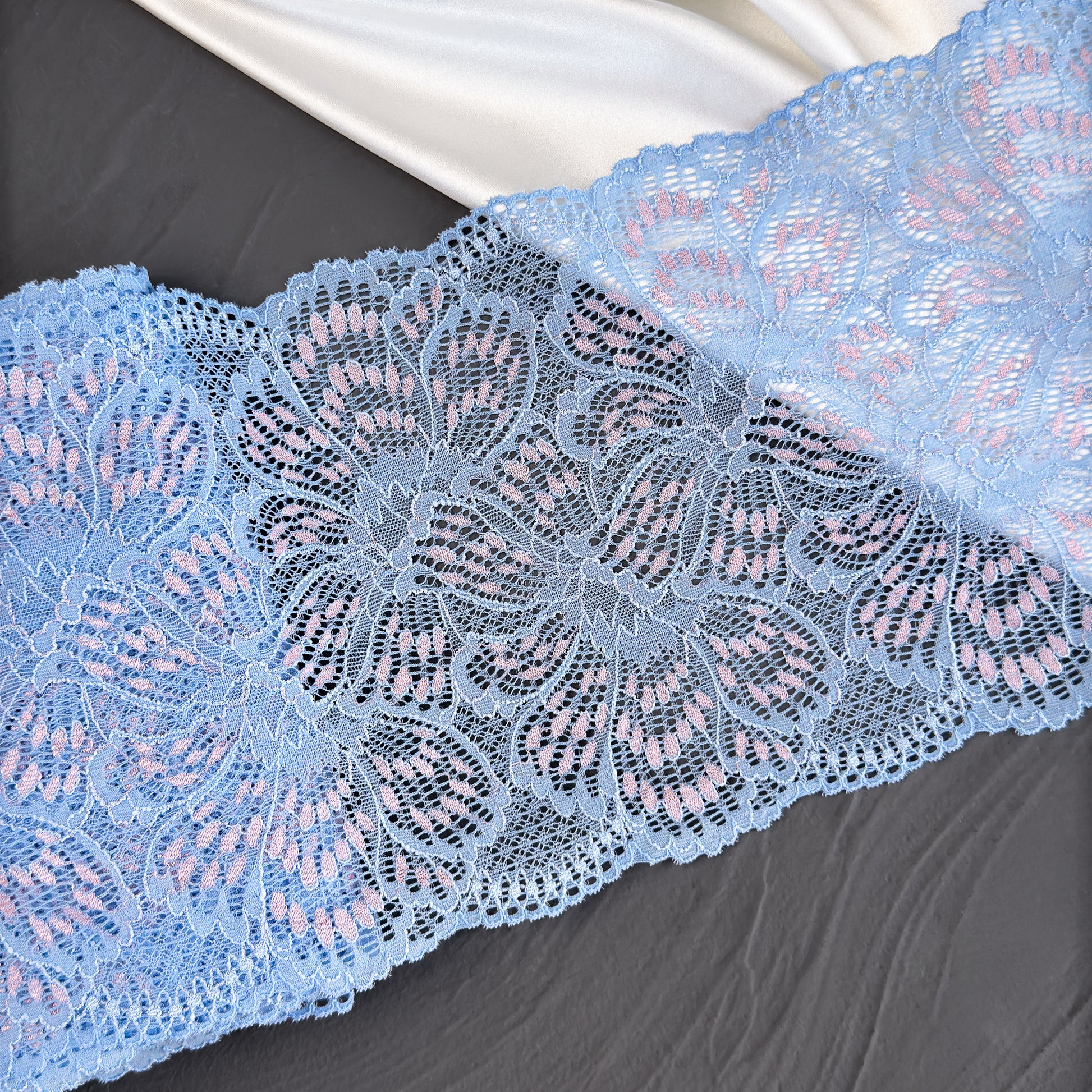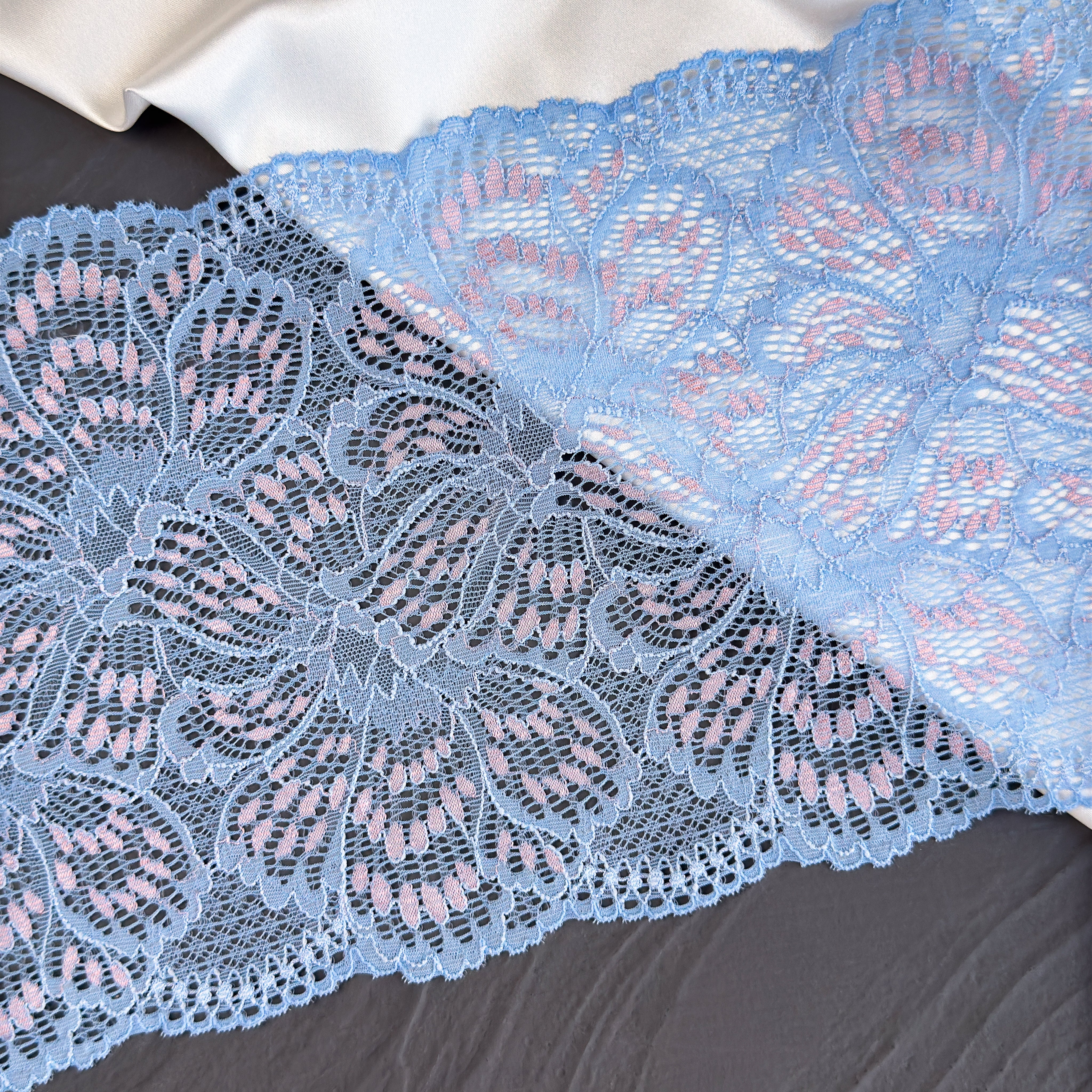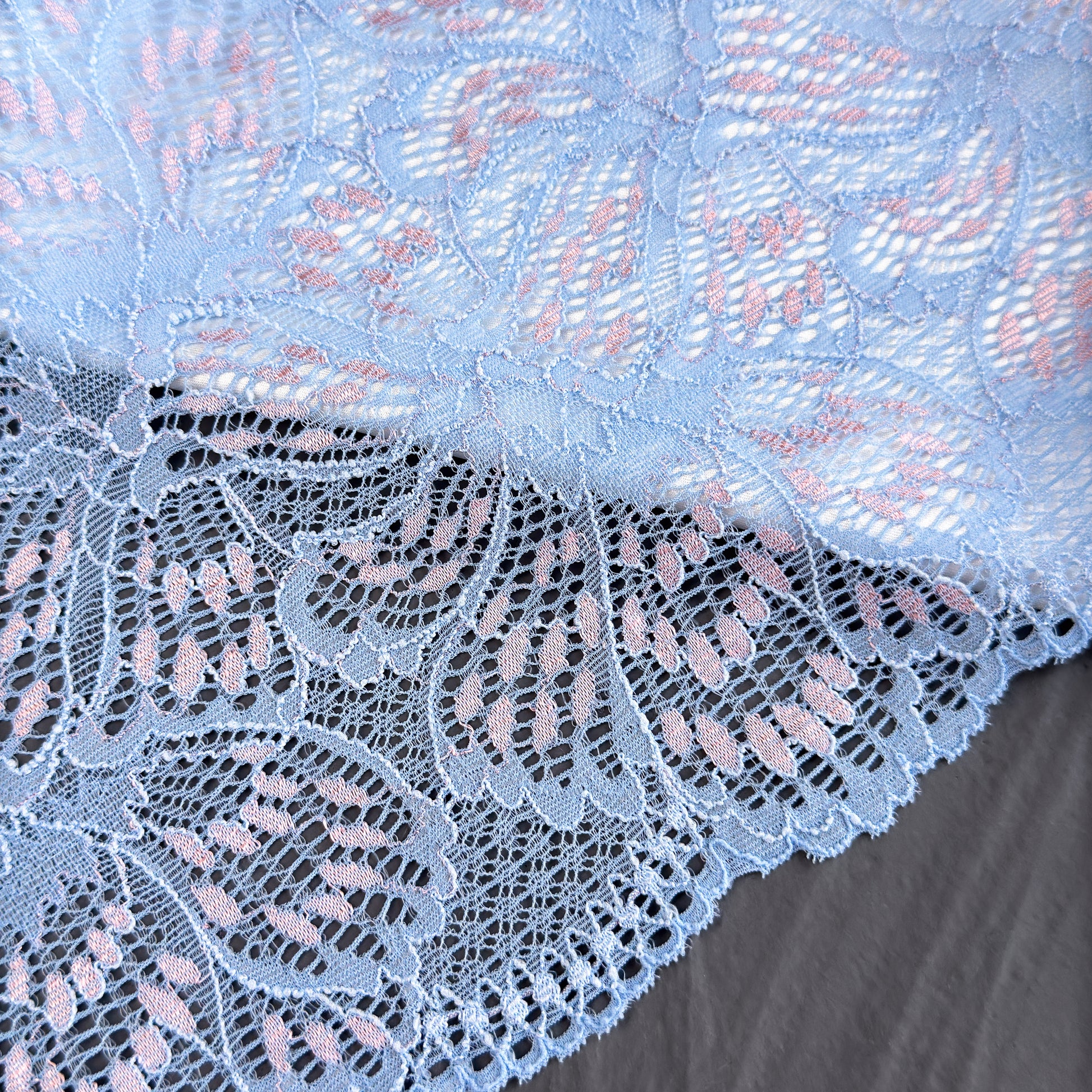 Soft and delicate light blue lace with subtle pink accents. This high-quality, versatile lace is not only soft to the touch but also perfect for a range of creative projects. Made in Europe.
