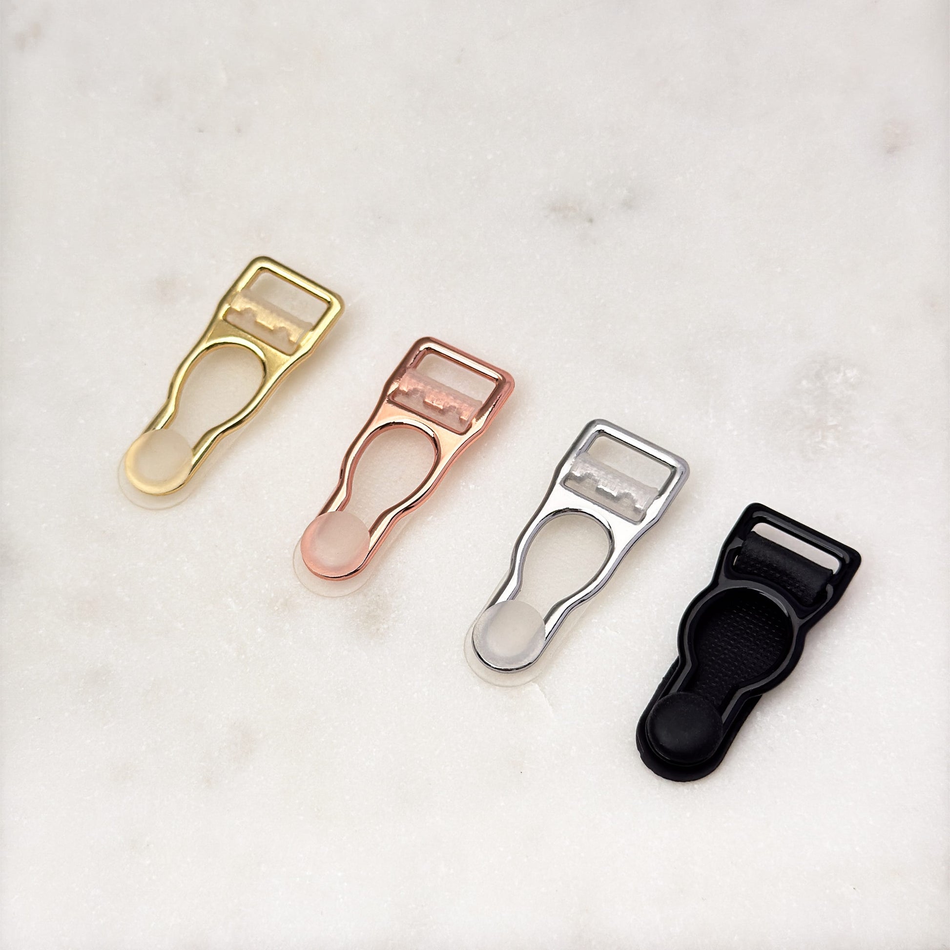 Create elegant garter belts with our 10mm rose gold-plated garter clips. Made from durable metal with a polished rose gold finish, these clips are designed to provide a secure hold with their sturdy plastic detail. Perfect for DIY projects and professional lingerie making, they ensure both functionality and a sophisticated look.