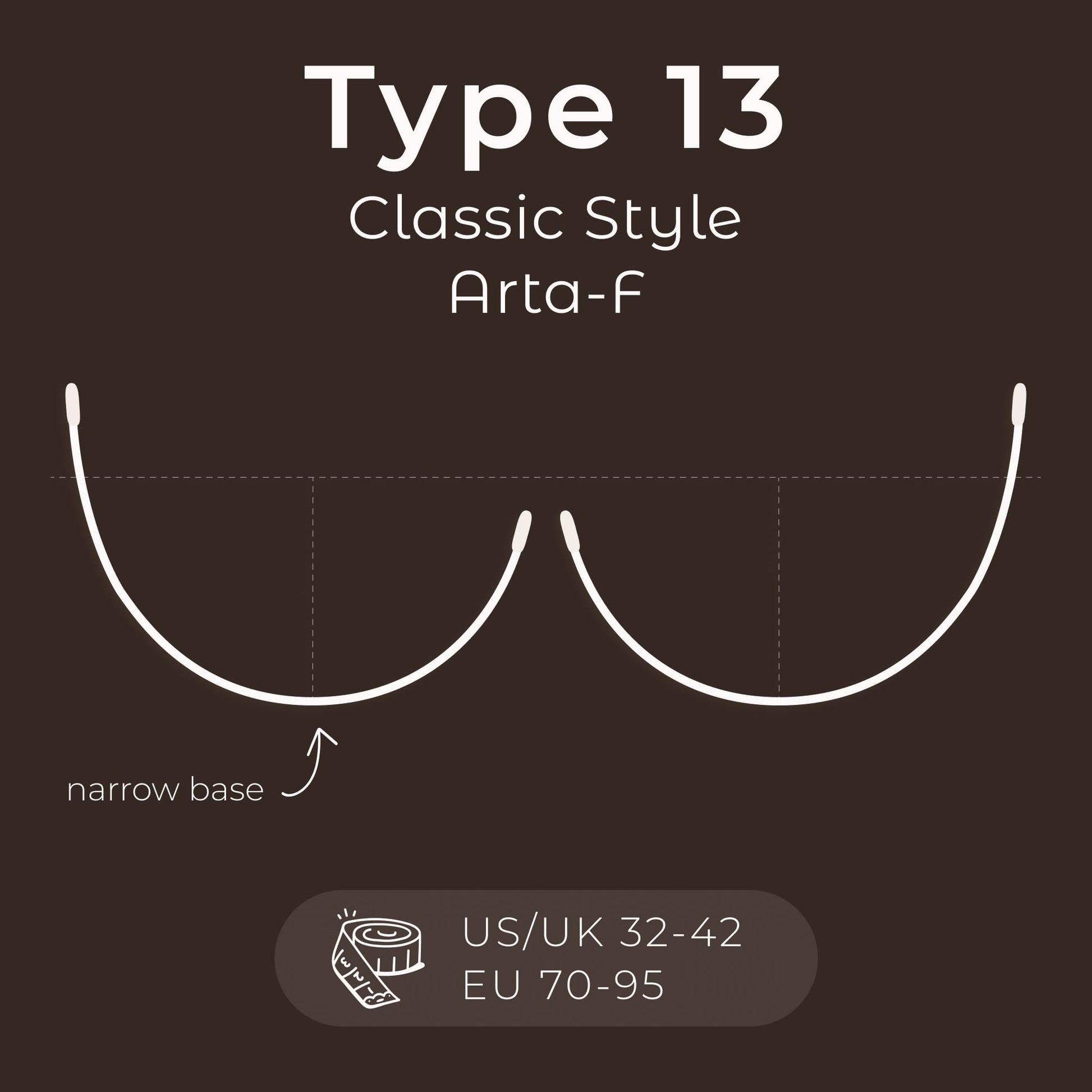 Type 13 - Classic Shape, Narrow base This is a classic bra shape with medium depth, ideal for a variety of everyday bra designs. A distinctive feature is the slightly lower center front, which gives the cup a more open appearance compared to other classic styles. The base of the wire is tapered, providing a comfortable and flattering fit, perfect for regular wear. Other classic styles available: Type 1 | Type 3
